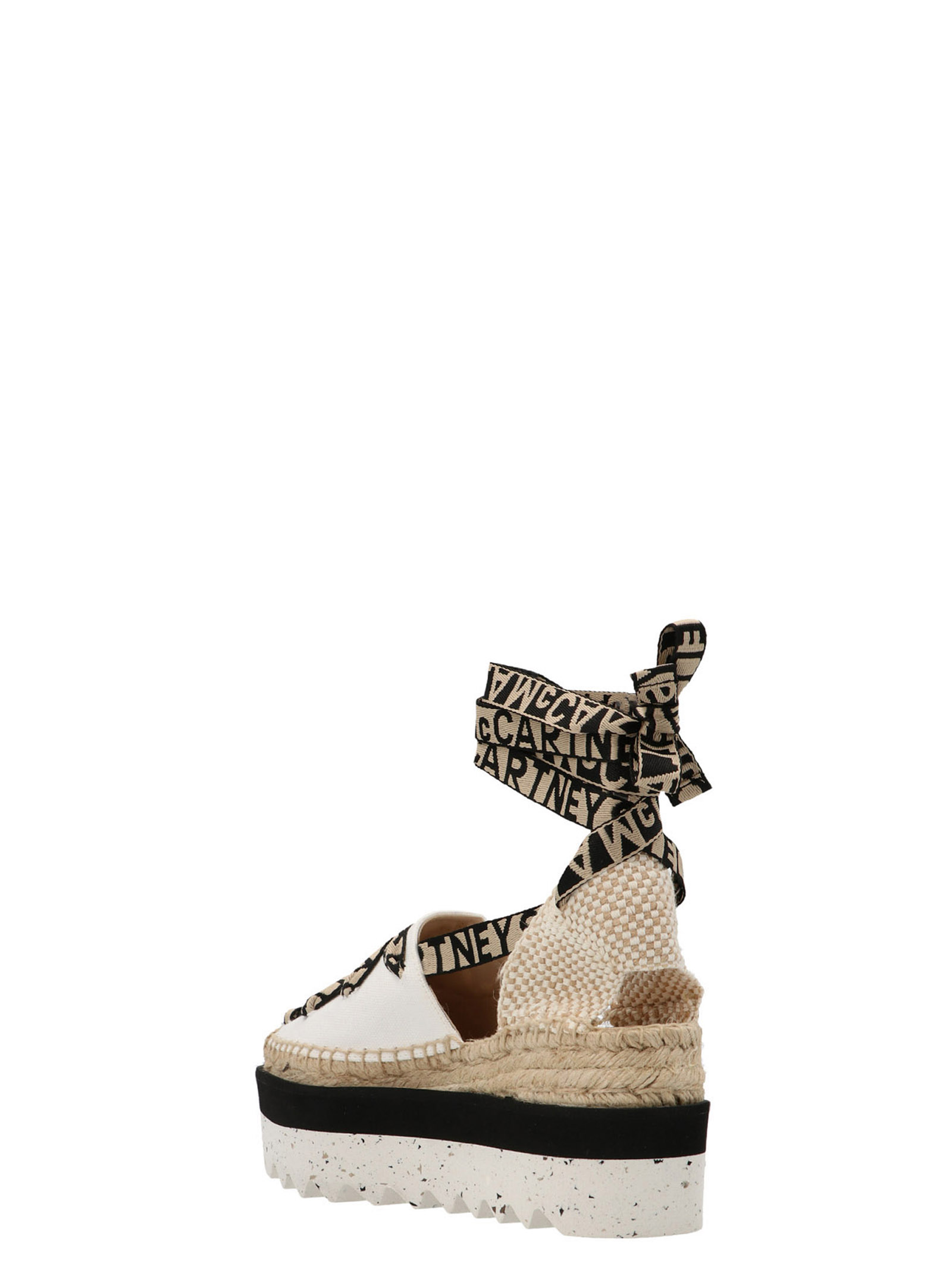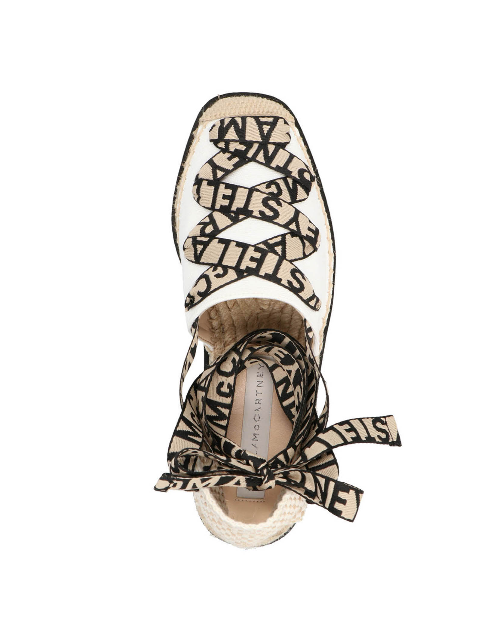 Stella McCartney canvas espadrilles with raffia sole covered in rubber and logo ankle straps. JULIAN SUSTAINABLE: produced with sustainable materials.