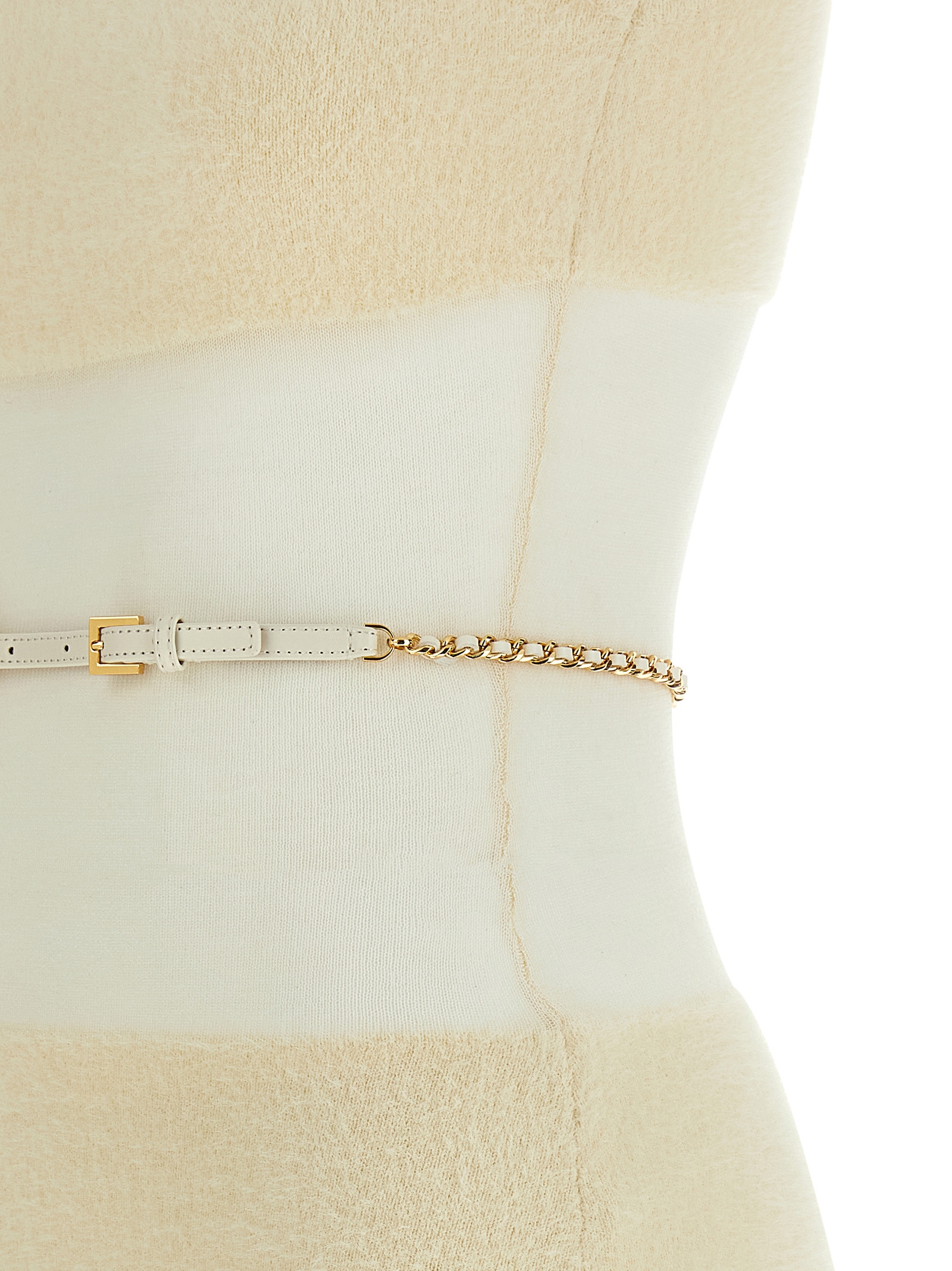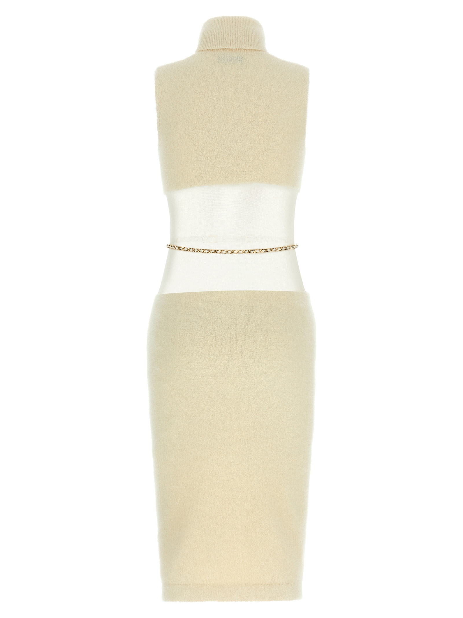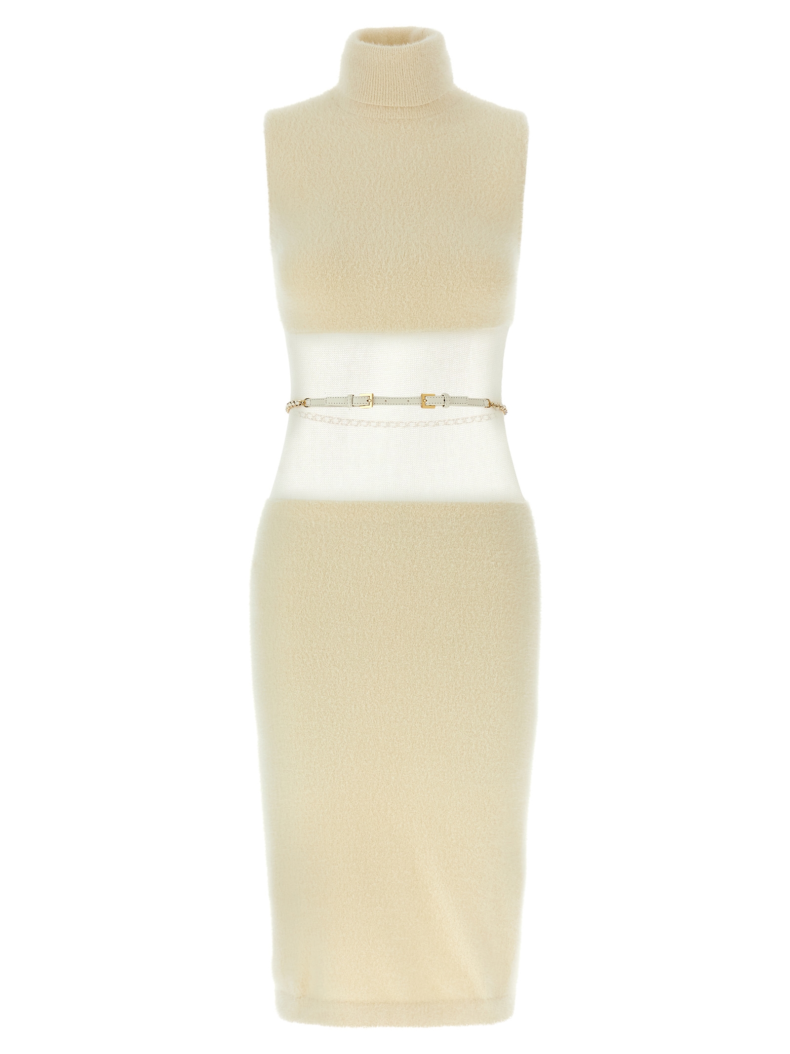 Fur-effect stretch knit midi dress with semi-transparent gauze insert at the waist, sleeveless turtleneck neck, longuette skirt, removable belt.