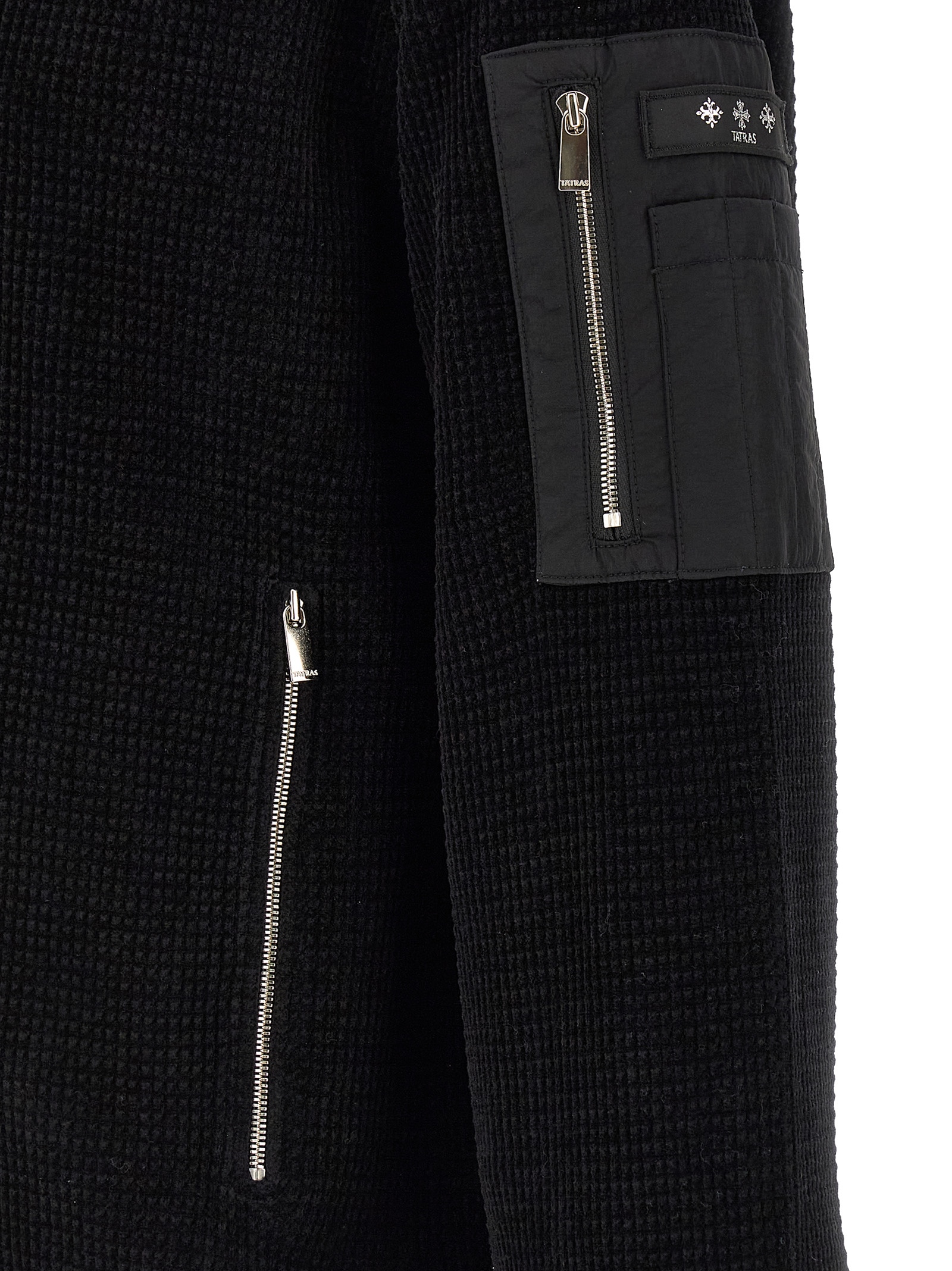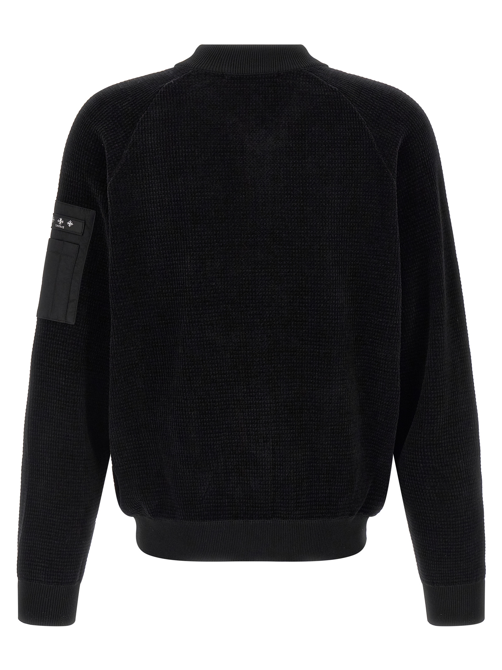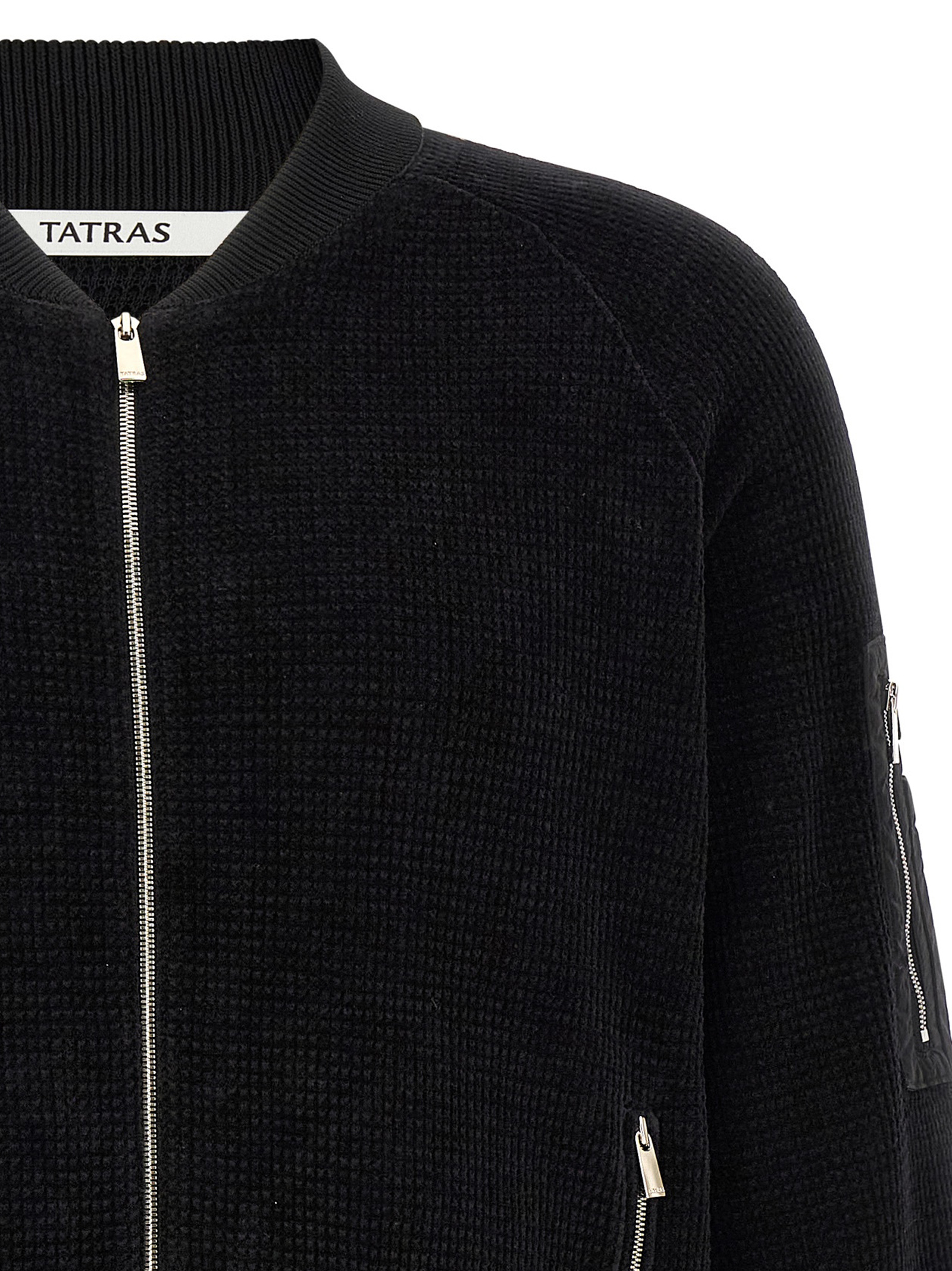 Waffle chenille ‘Gavrio’ bomber jacket with tonal stretch ribbed knit details, high neck, front zip closure, pockets, long raglan sleeves with cuffs, and headband.