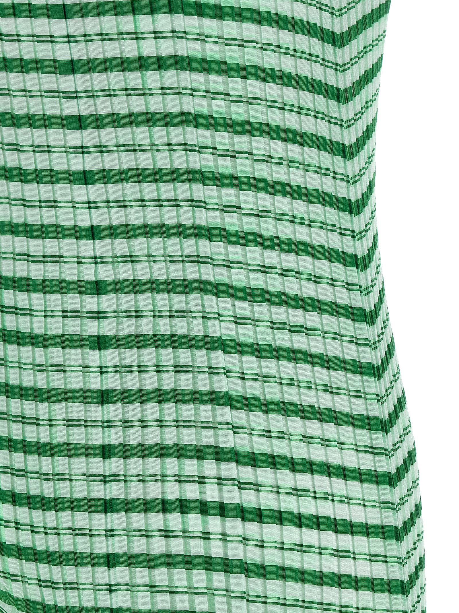 Long ‘Generic Stripes (Machine Pleats)’ dress in semi-transparent pleated fabric with striped moirรฉ effect, high neck with button closure and back teardrop cut-out detail, sleeveless, asymmetrical hem with sculptural design.