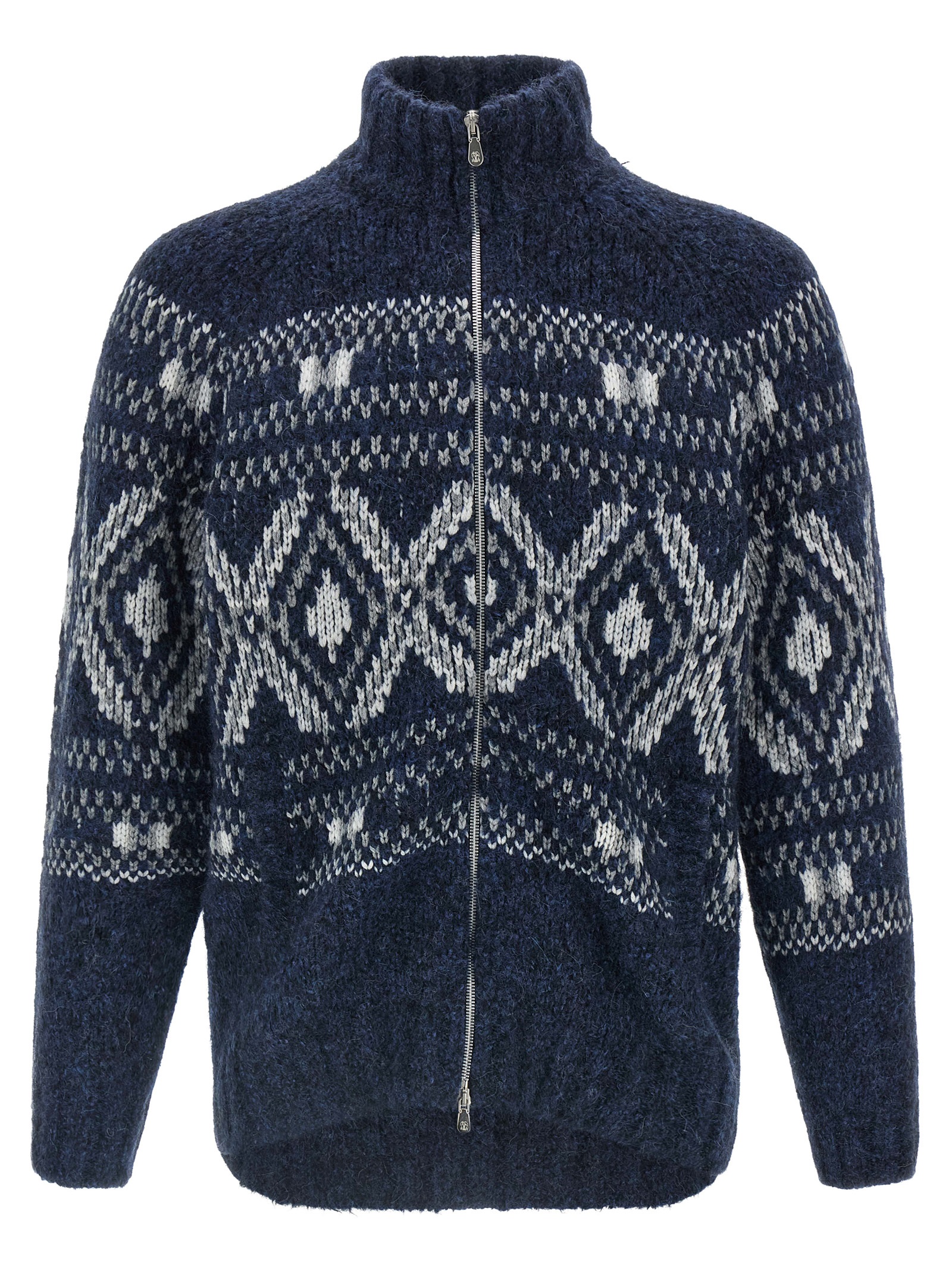 ‘Geometric jacquard’ cashmere blend wool cardigan, high neck, front zip closure, long cuffed sleeves.