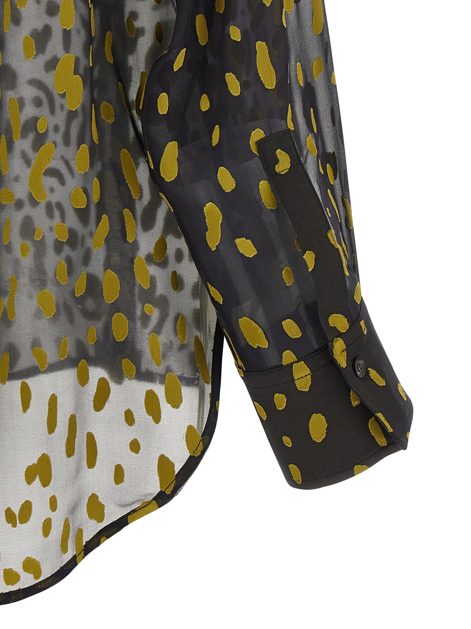 Semi-transparent animal print georgette shirt made with the devouré technique, front button closure, long sleeves with cuffs and dropped shoulders, rounded hem.