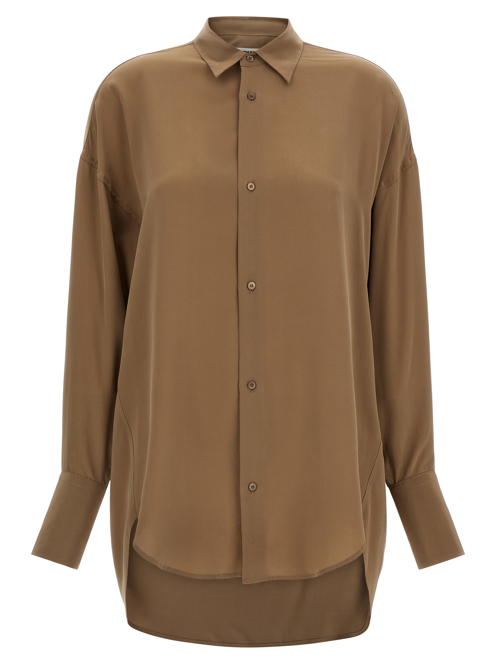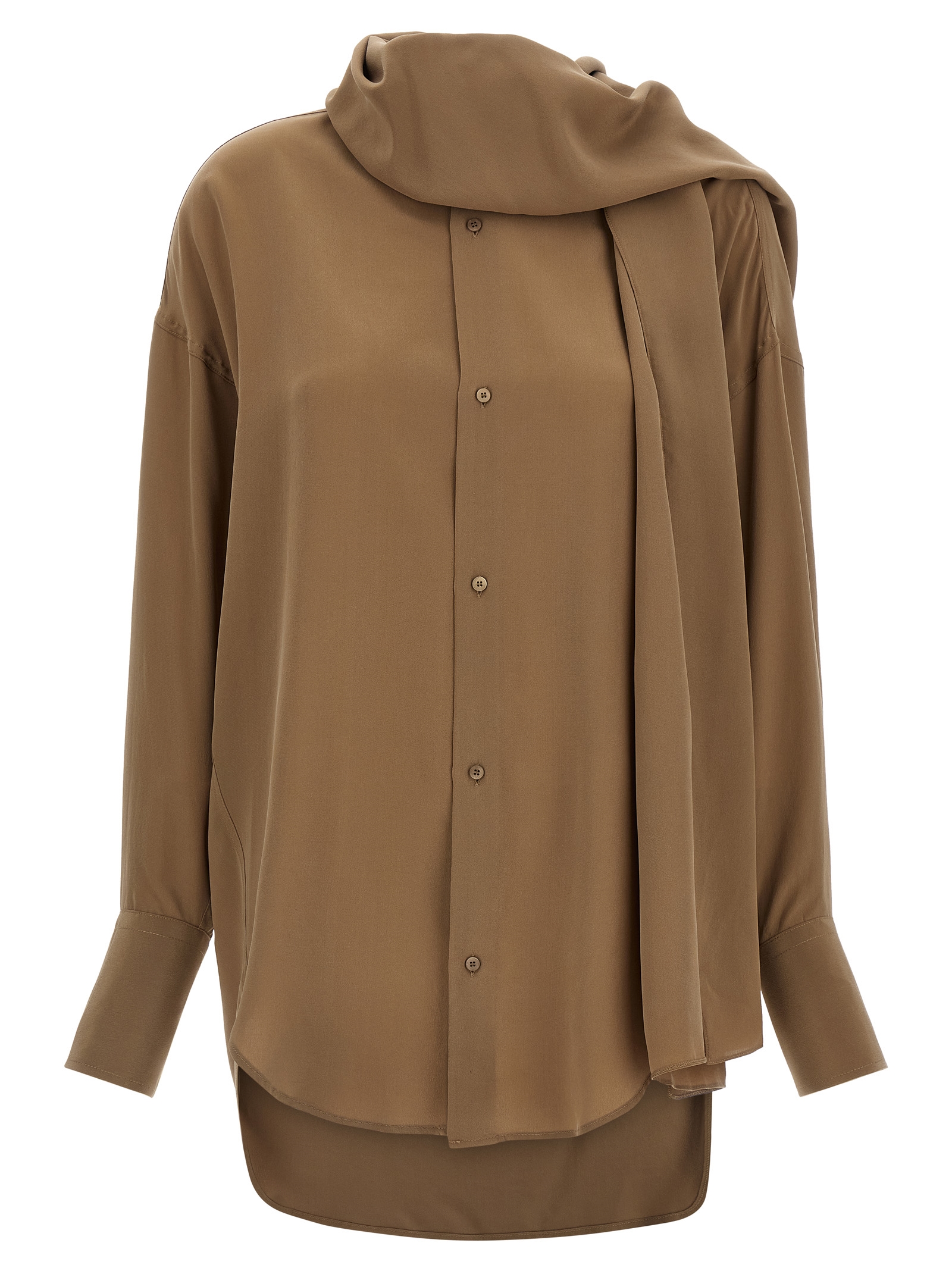 Classic collar ‘Georgia’ silk shirt with front button closure, detachable matching scarf with button on the back, rounded side slits, long sleeves with cuffs and buttons.
