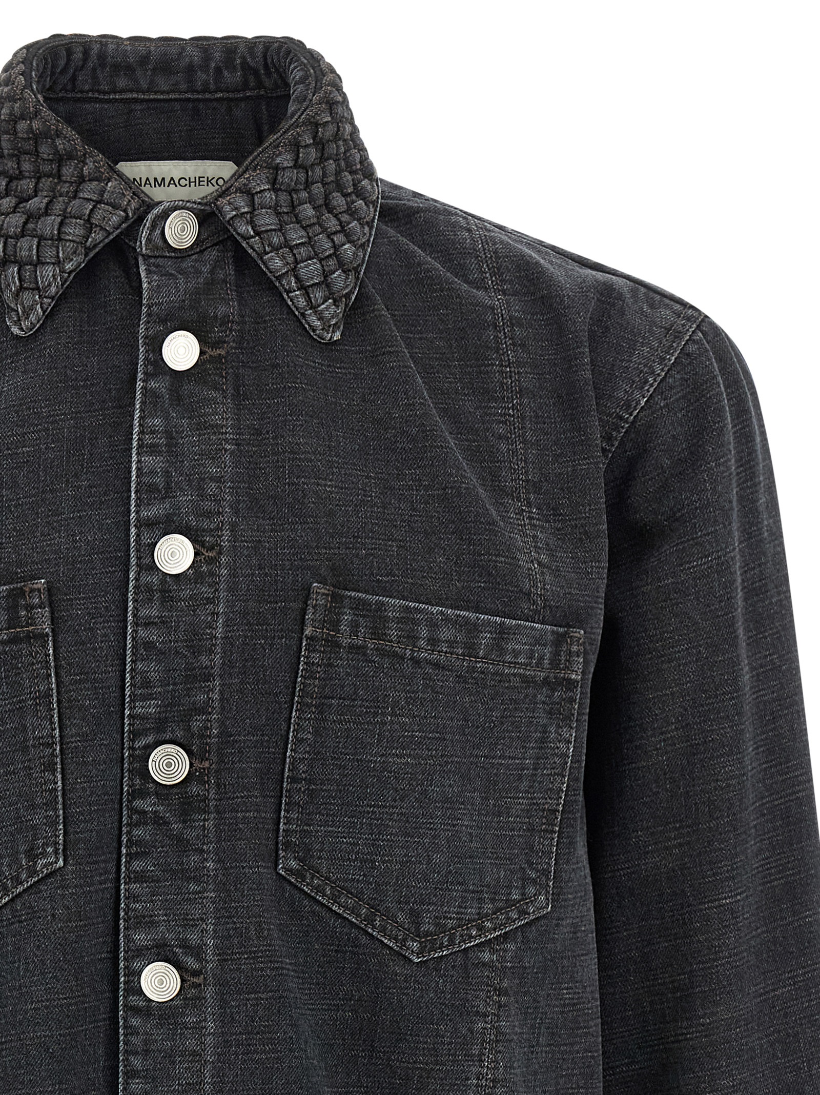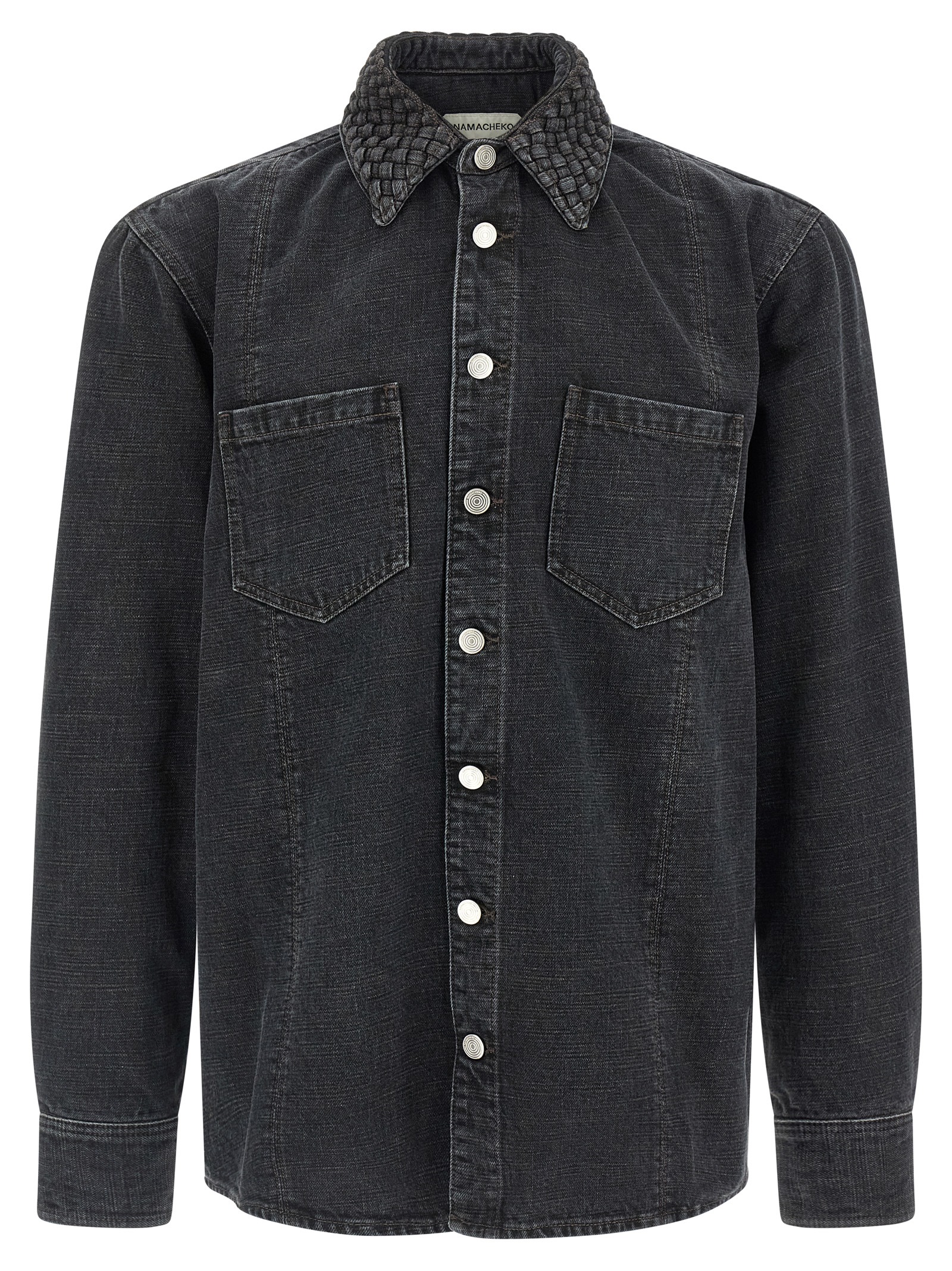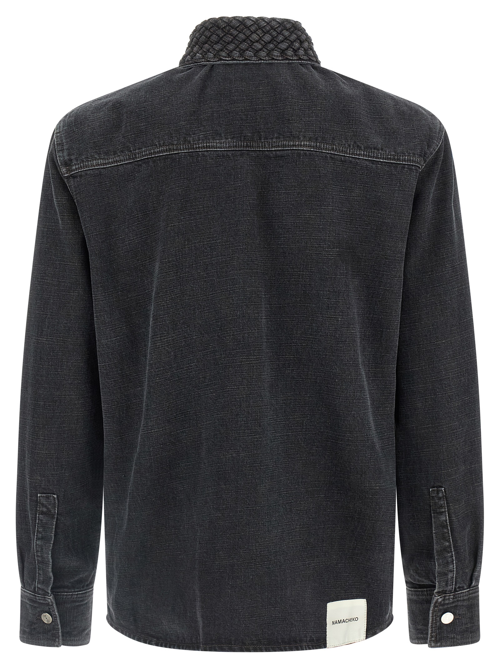 ‘Gervis Braided’ denim shirt made of flamed yarn woven like a canvas and stone washed with streaked effect, braided collar, pockets, front button closure, long sleeves with cuffs and dropped shoulder.