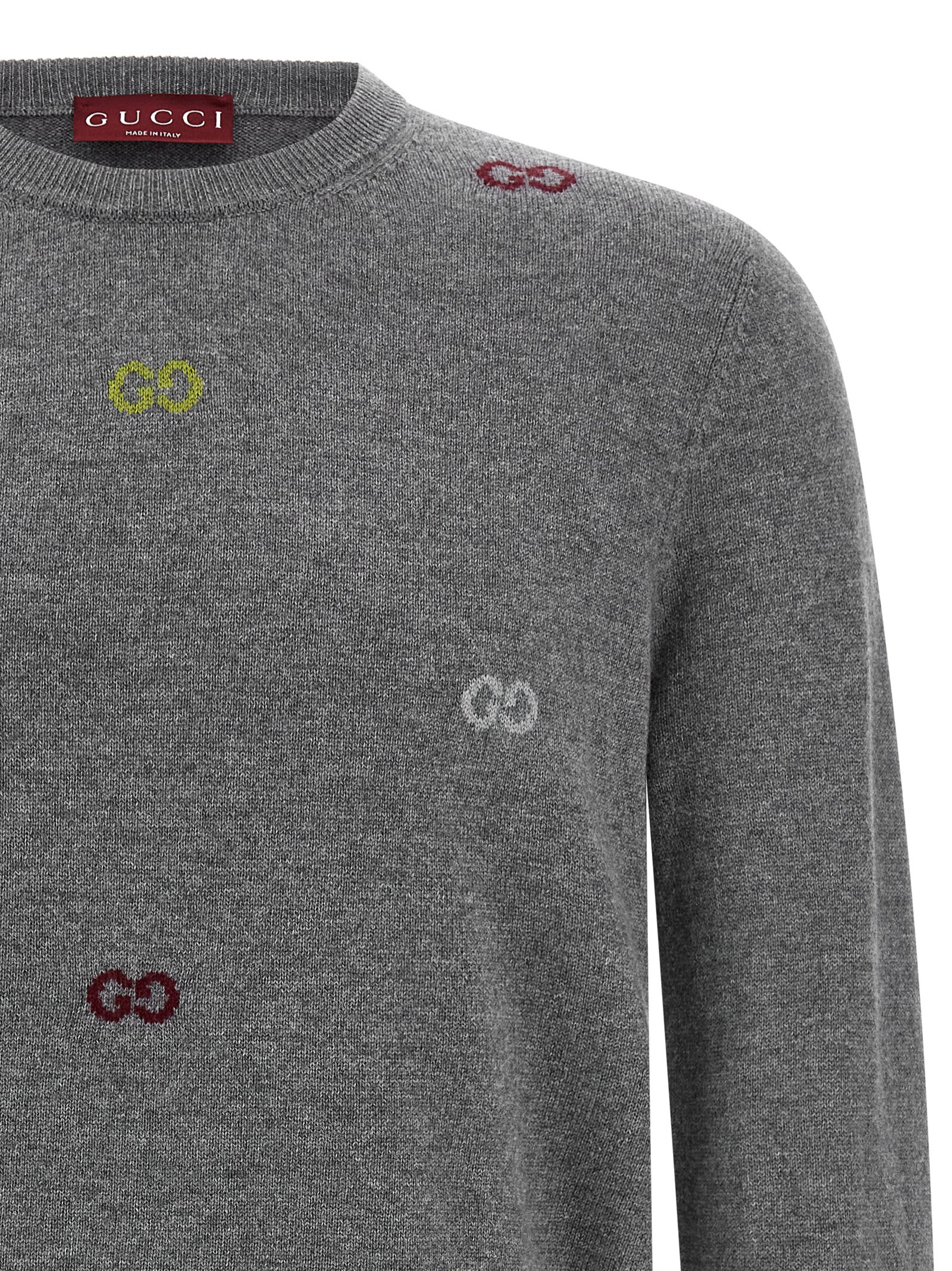 Fine cashmere sweater with multicolor GG intarsia, round neckline, long cuffed sleeves.