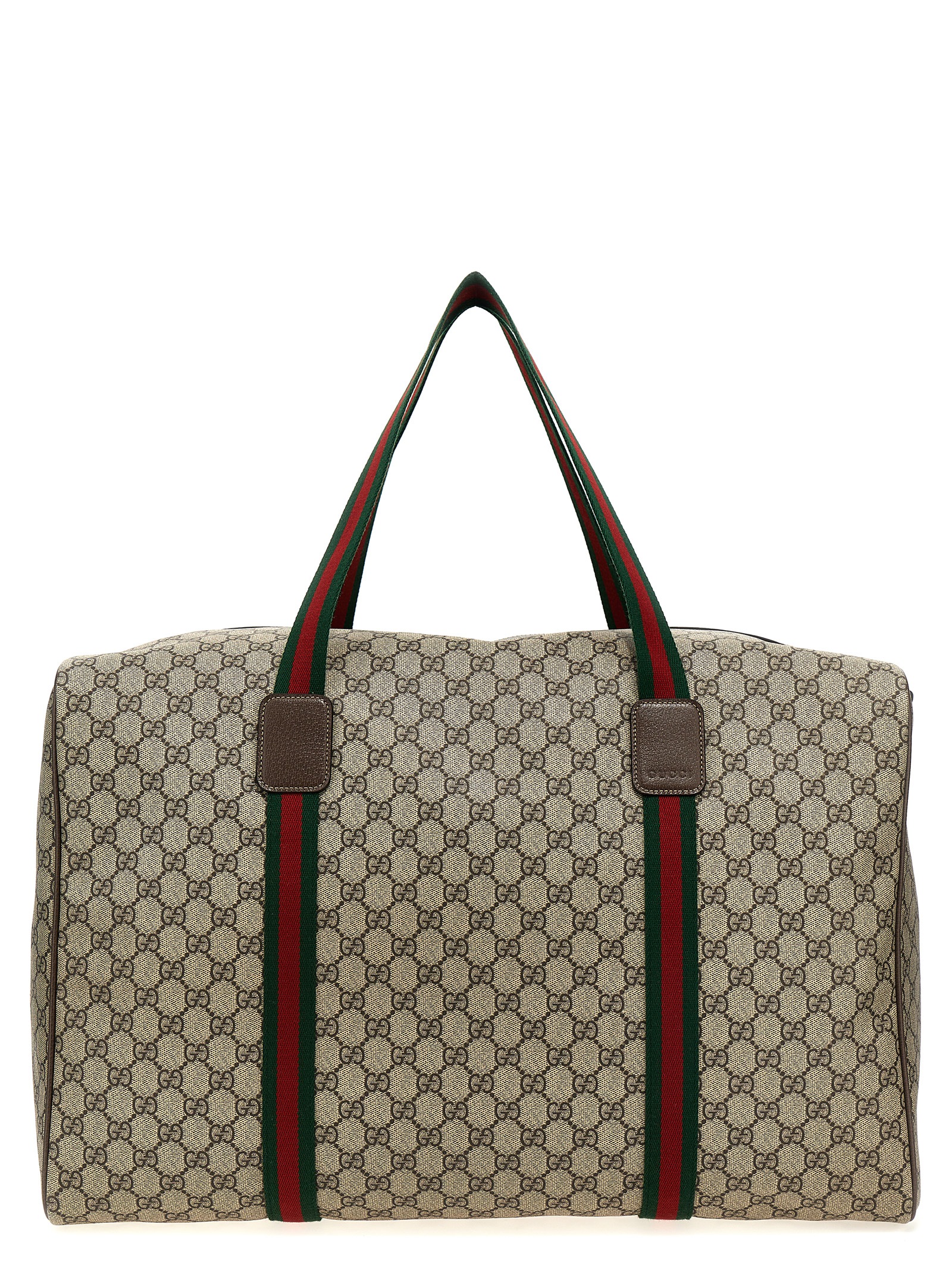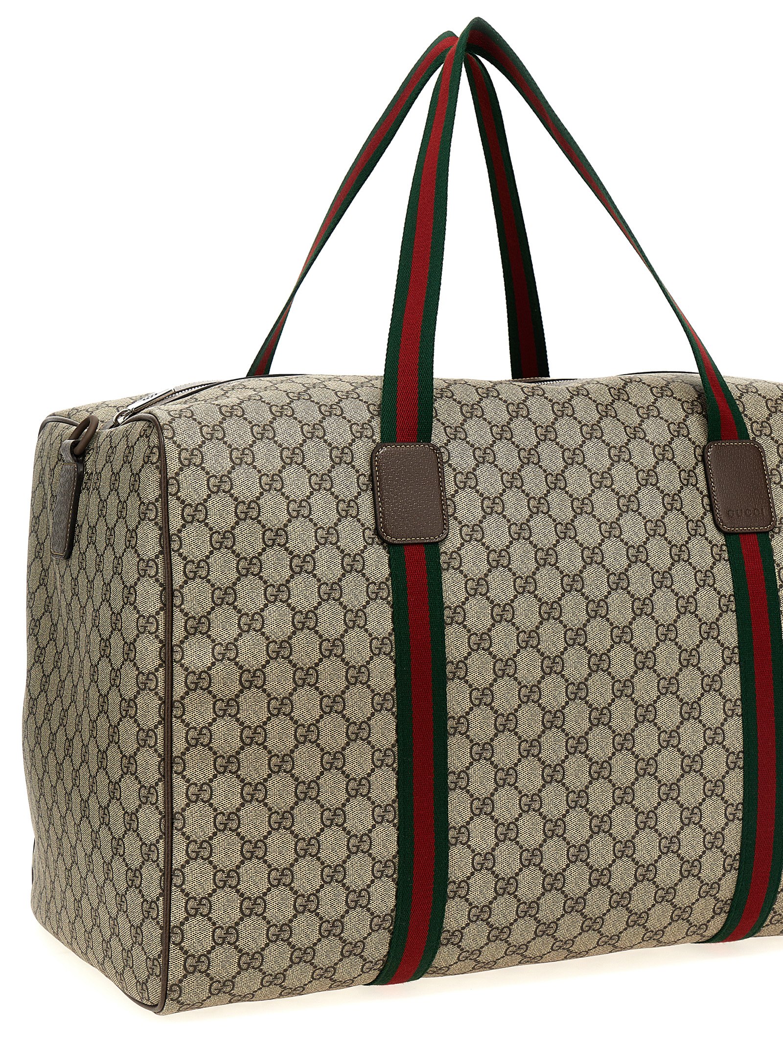 ‘GG Supreme’ fabric duffel bag, leather details, double web tape handle, zip closure, adjustable and removable shoulder strap.