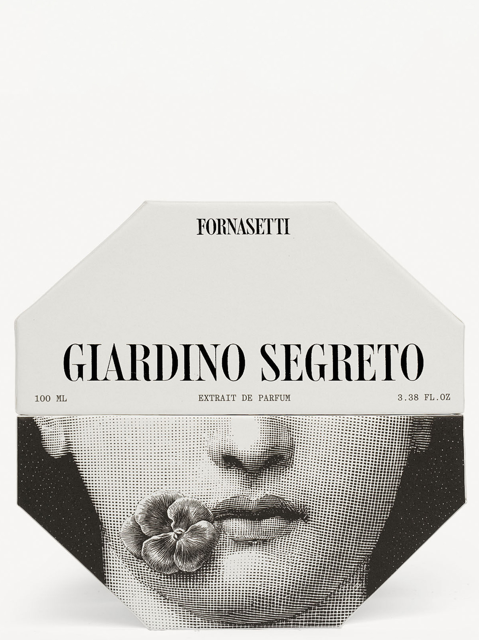The Giardino Segreto fragrance is visually interpreted by the face of the 19th century opera singer, Lina Cavalieri, who was both a classical beauty with an enigmatic gaze and Fornasetti’s muse, and who is now an icon.The poetic flower in her mouth evokes the green olfactory family.