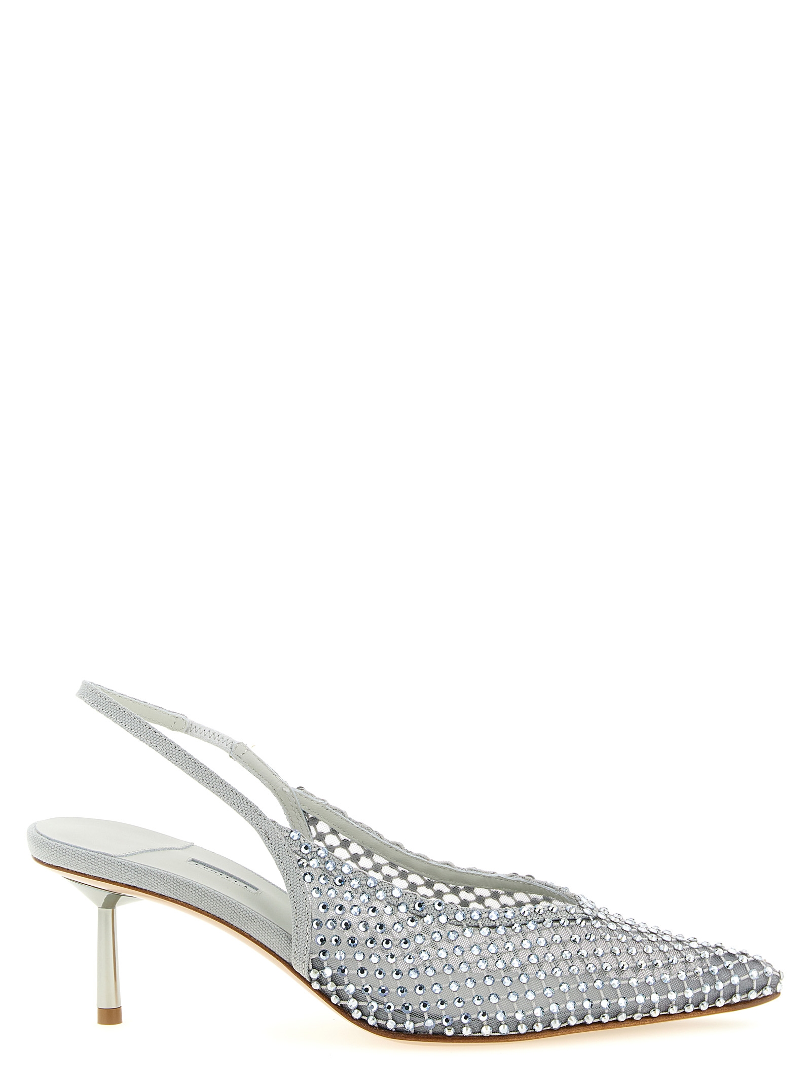 ‘Gilda’ semi-transparent mesh slingbacks with all-over crystal application and tone-on-tone cotton canvas, silver ‘Eclissi’ upper, pointed toe, elastic strap, stiletto heel, leather sole with non-slip central rubber.