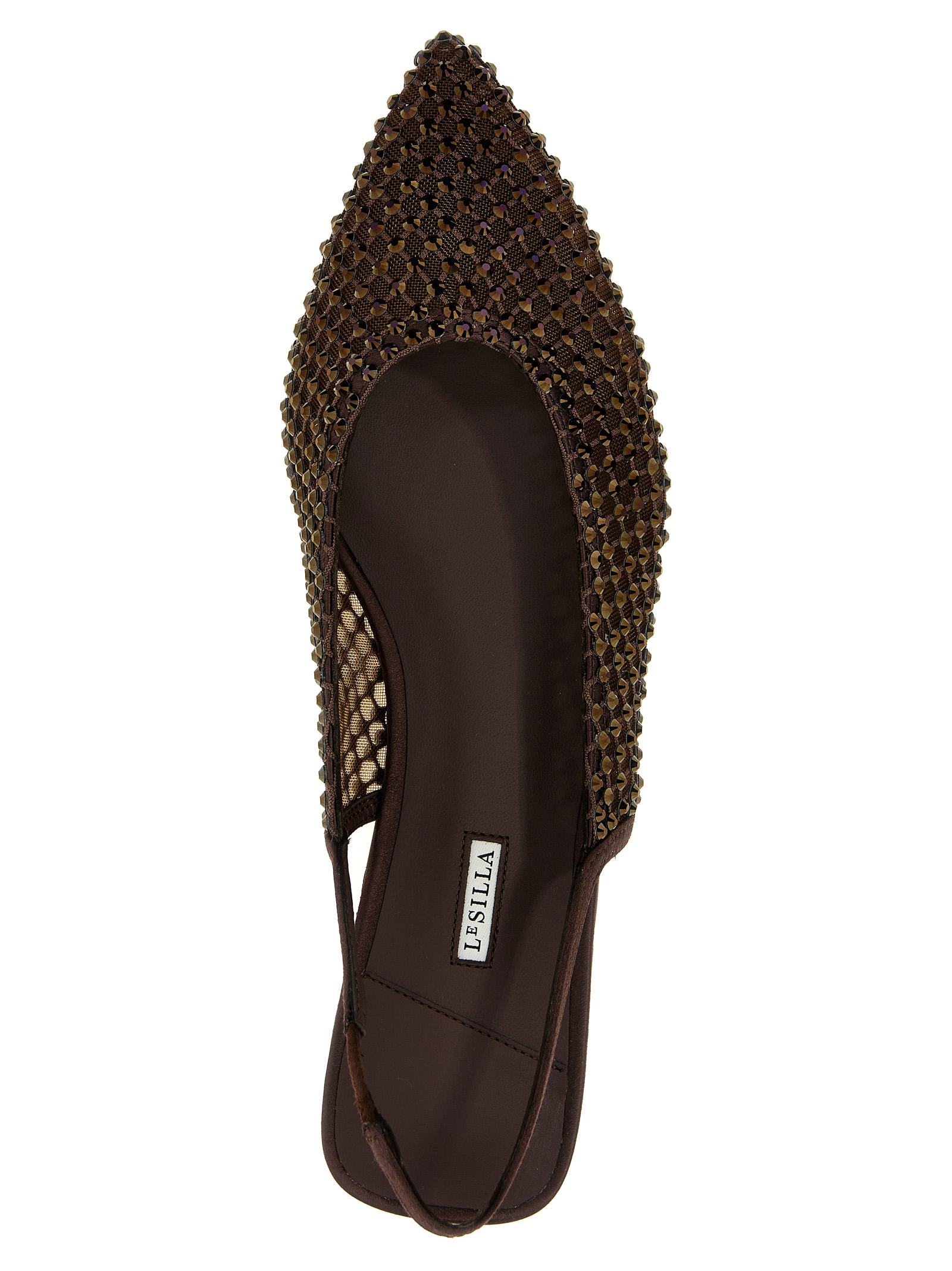 ‘Gilda’ slingbacks in mesh fabric with all-over rhinestones, pointed toe, elastic satin strap, rubber sole.