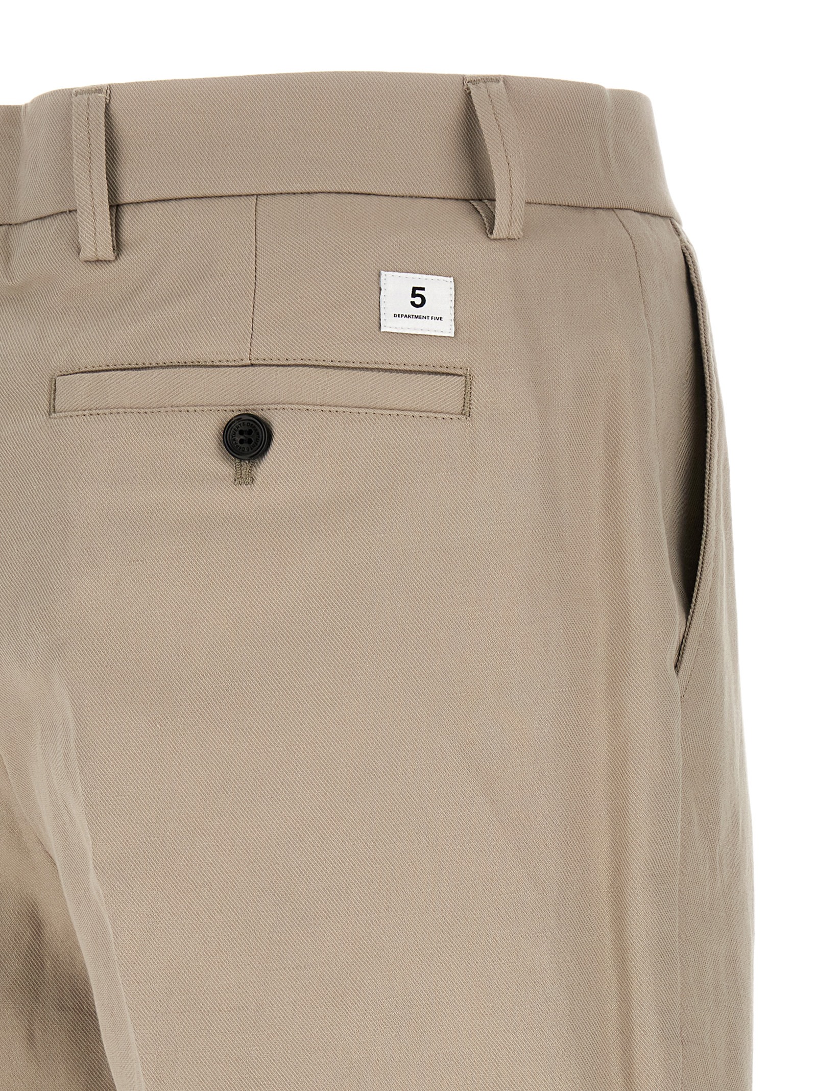 ‘Gin’ cotton and linen blend sain pants, wide leg, pins, stretched pleat, front zip and button closure, front American pockets, logo patch and back welt pockets.