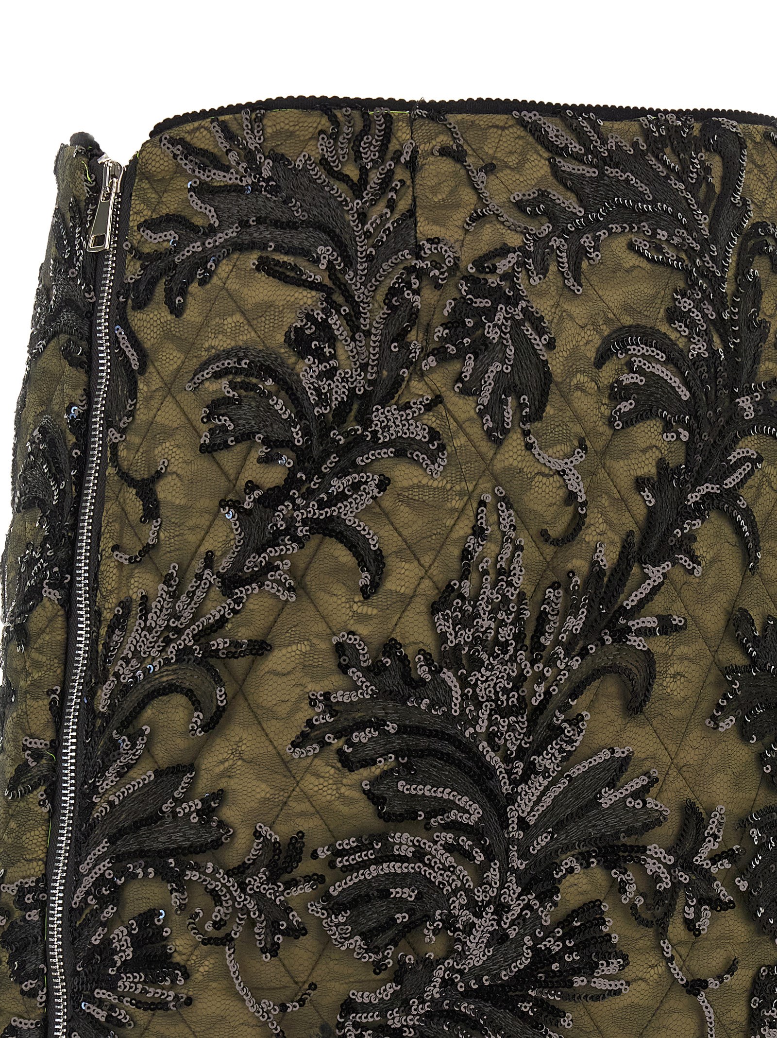 Mini ‘Giulia’ skirt in quilted fabric covered in lace with all-over sequin appliqué, back zip closure, and asymmetrical hem.