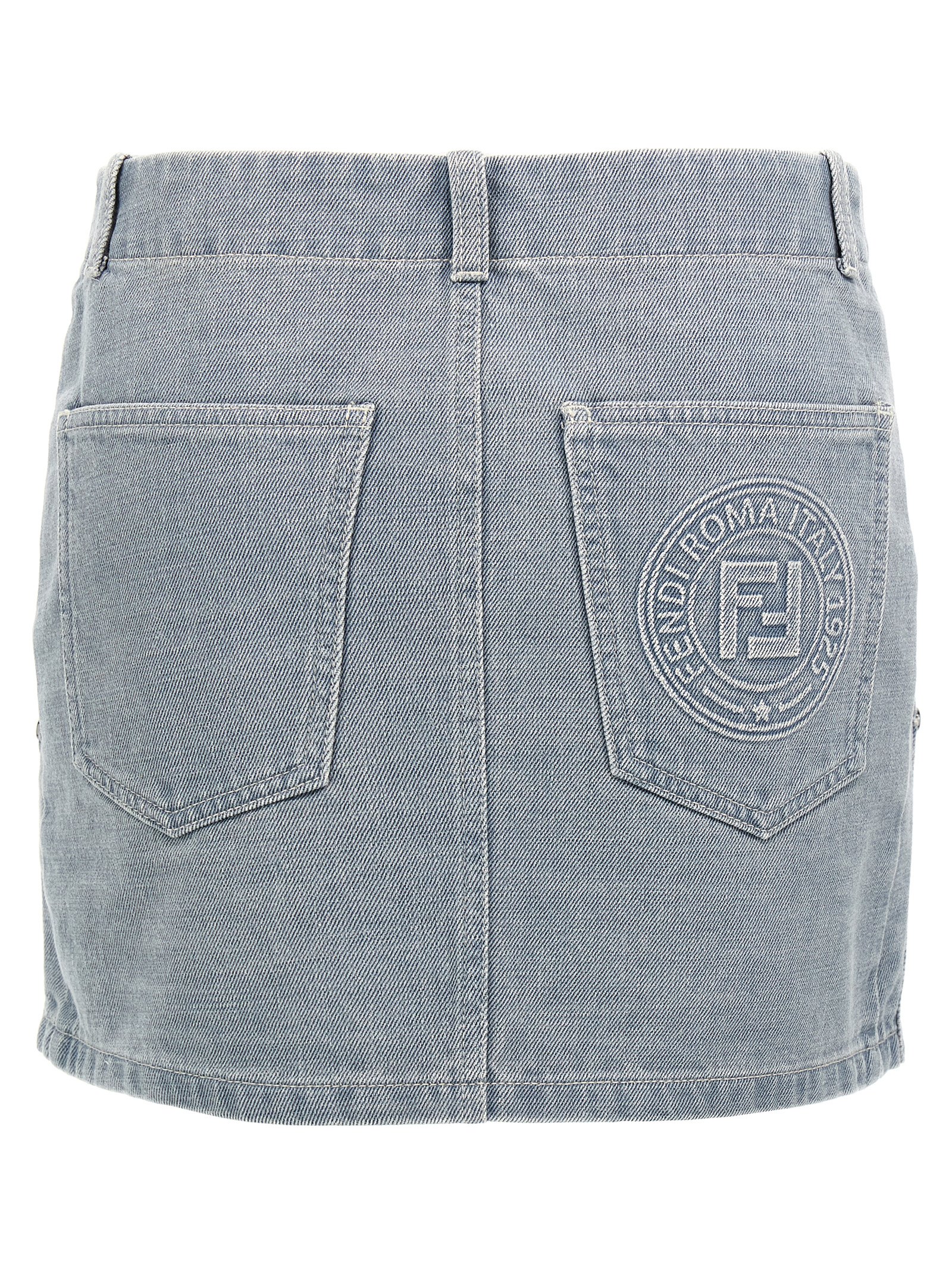‘Go-To’in denim di cotone, stampa ‘Fendi Stamp 1925’ embossed miniskirt at the back, front zip closure, pockets.