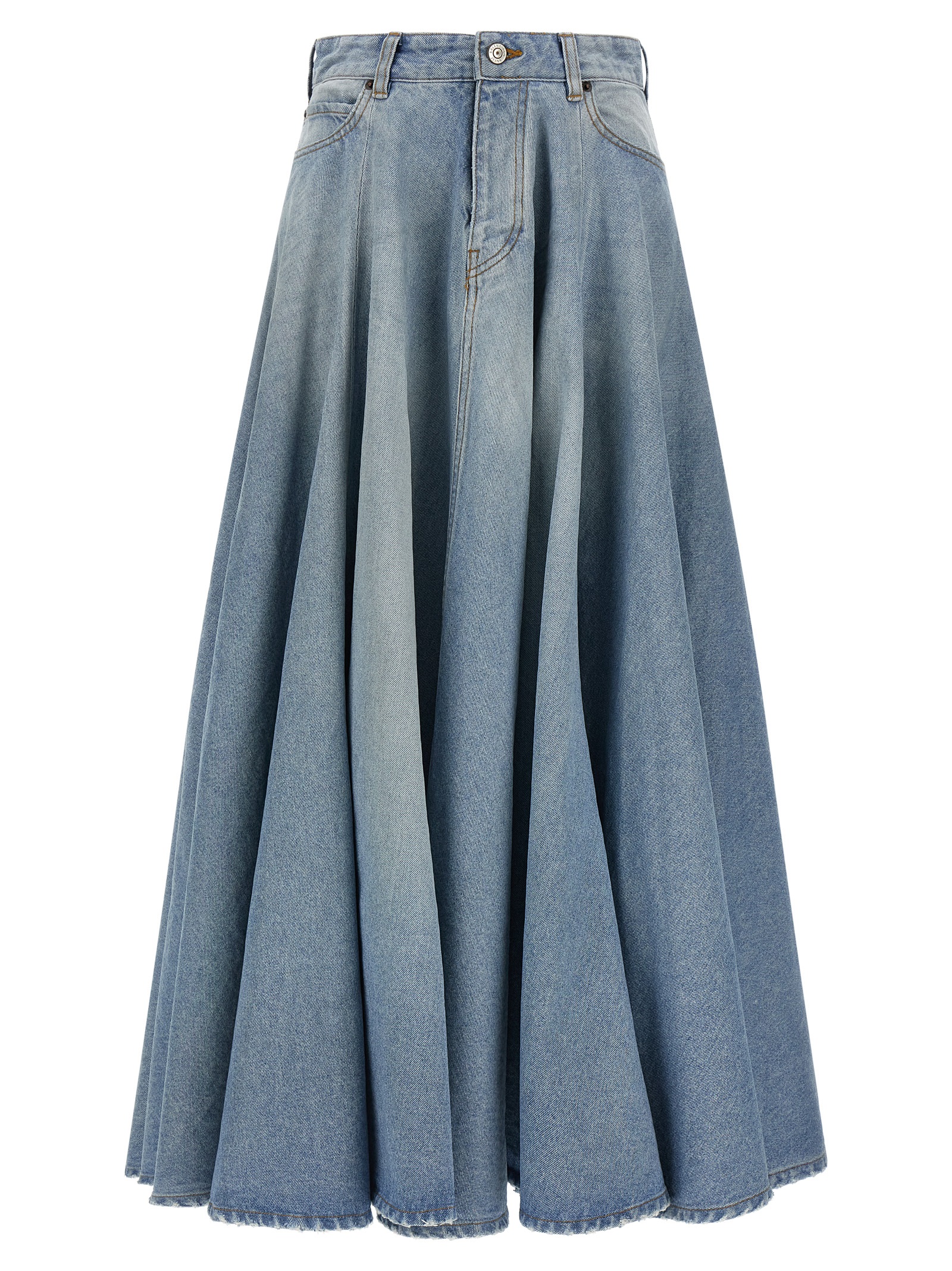 Midi skirt in washed and worn cotton denim with ‘Godet’ cut, contrast stitching, front zip and button closure, pockets, mid waist, back logo tag.