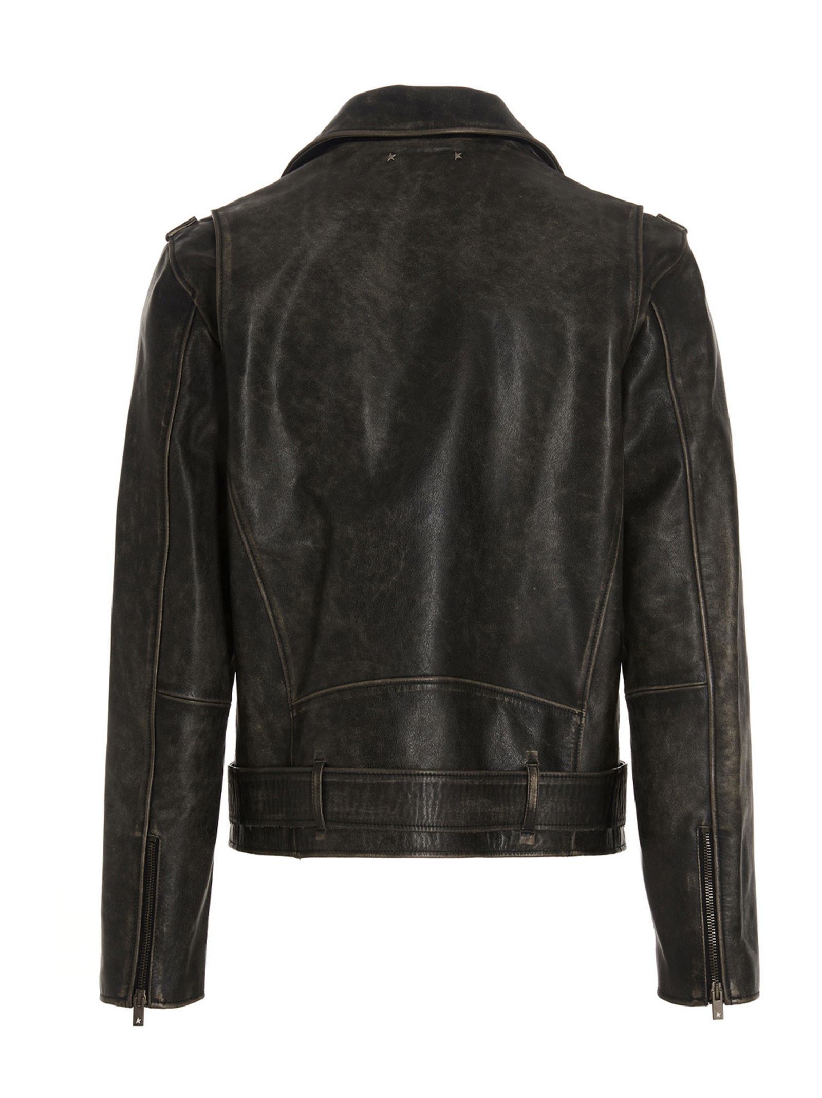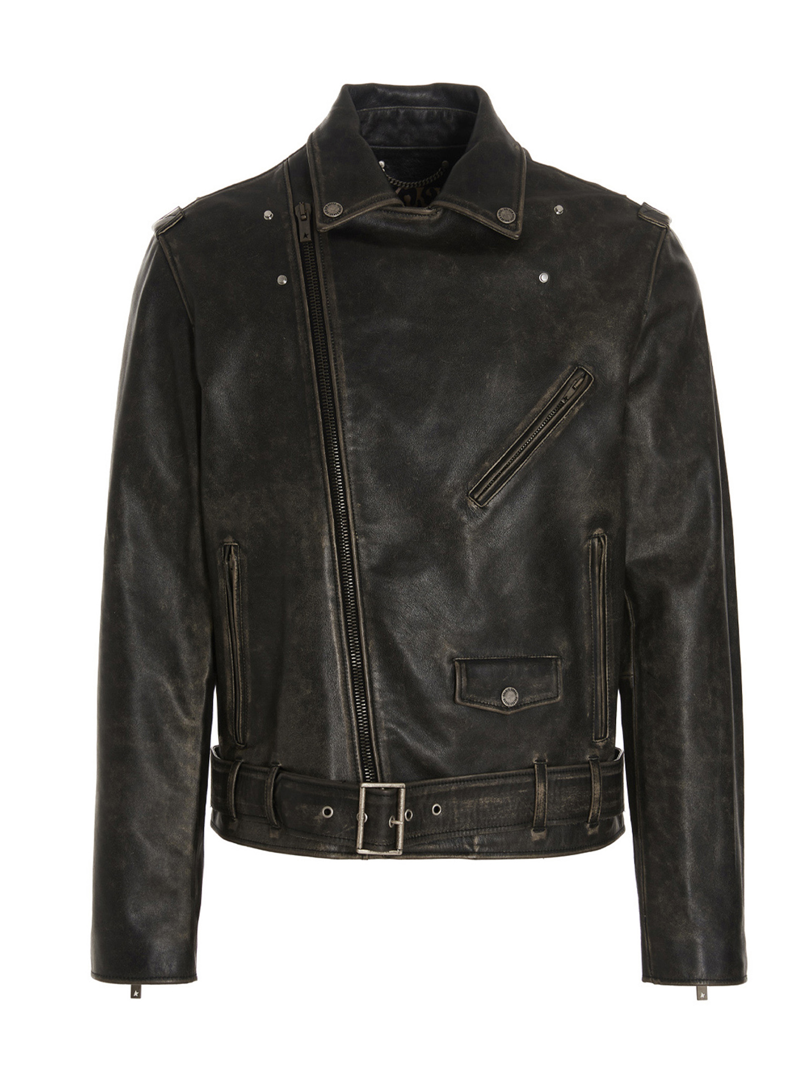 ‘Golden’ vintage effect leather biker jacket with distressed details, oblique zip closure, belt and antiqued metal details.