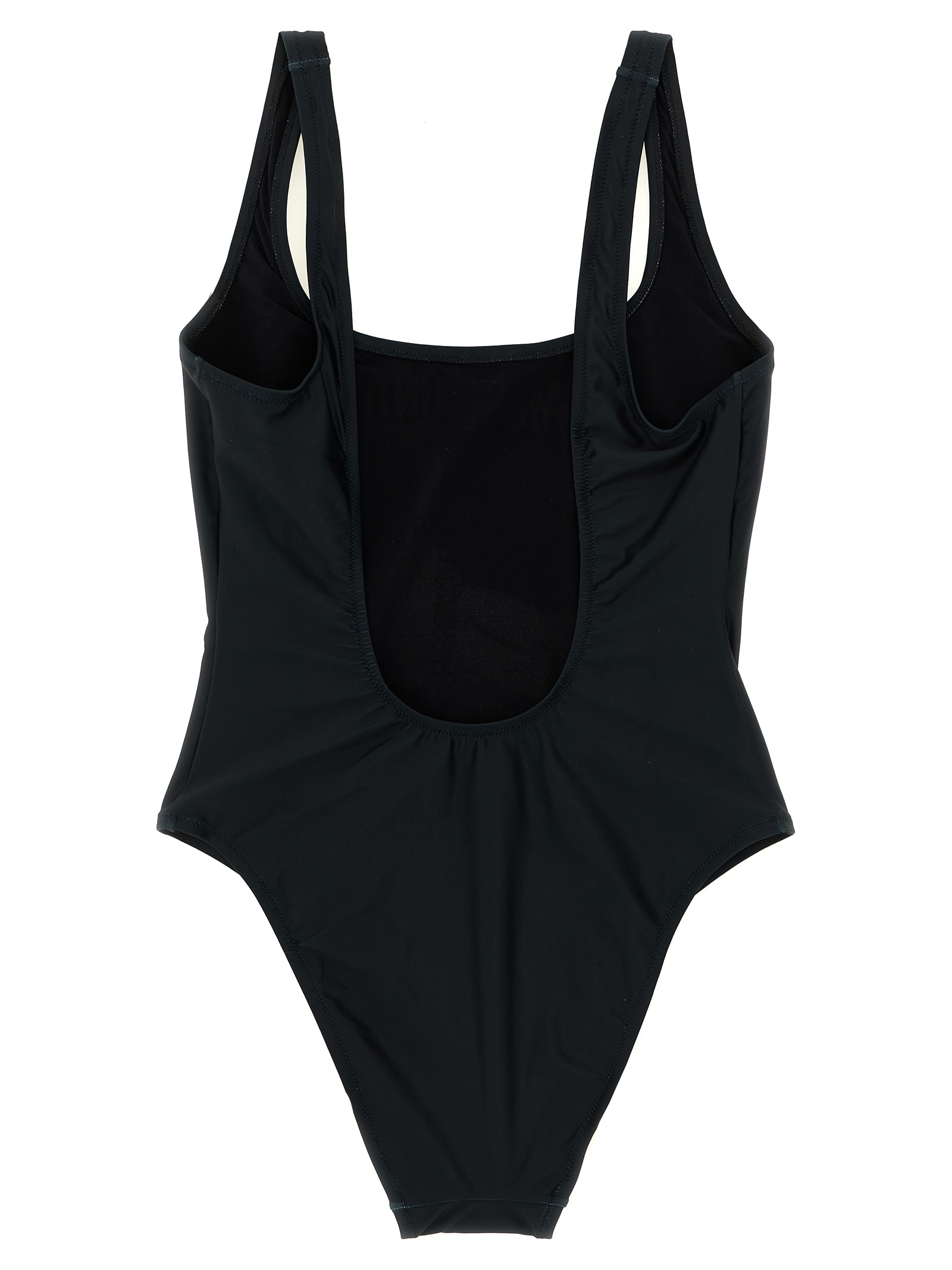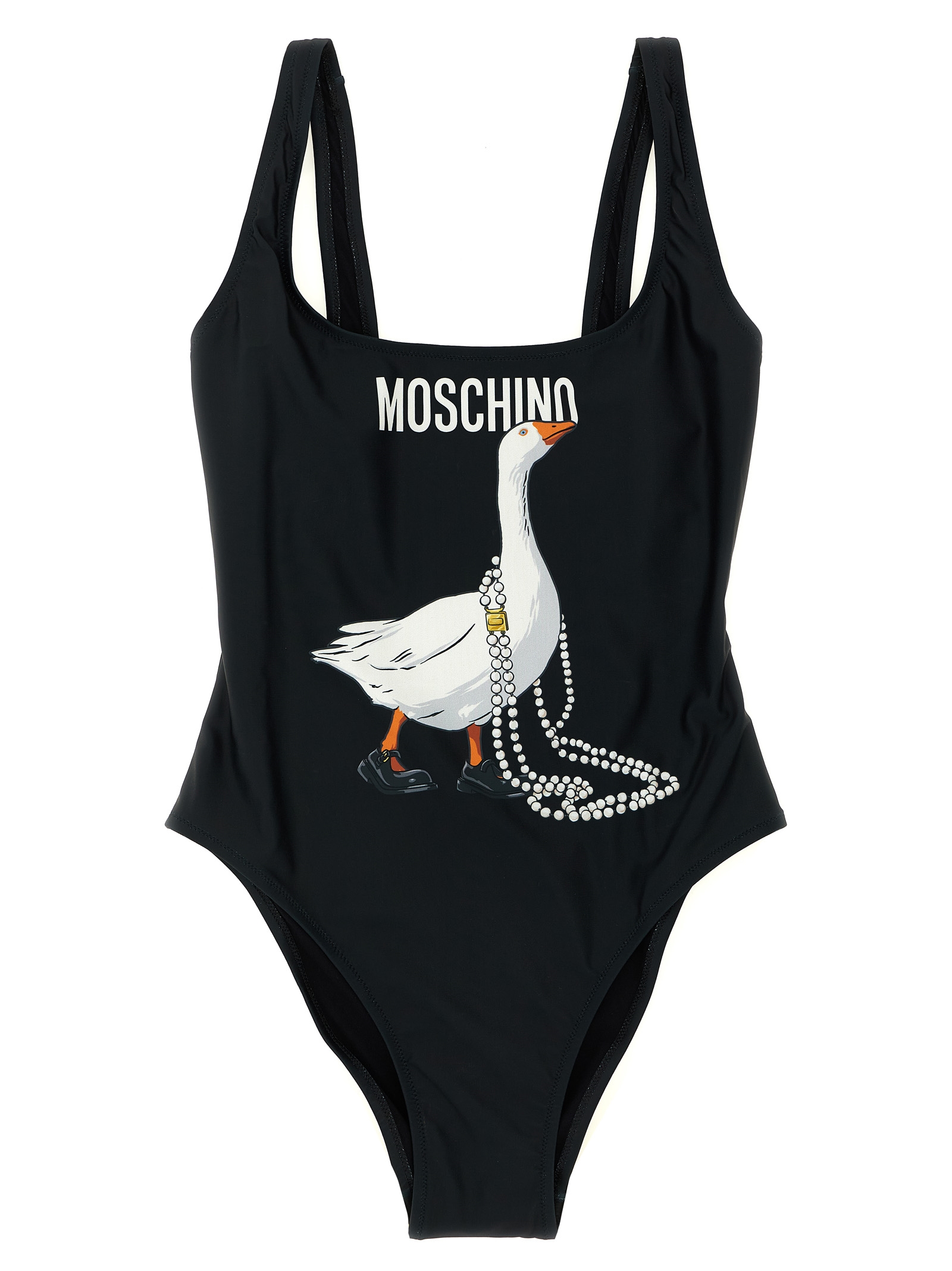 Lycra one-piece swimsuit, front ‘Goose’ print, wide round neckline at the front and back.
