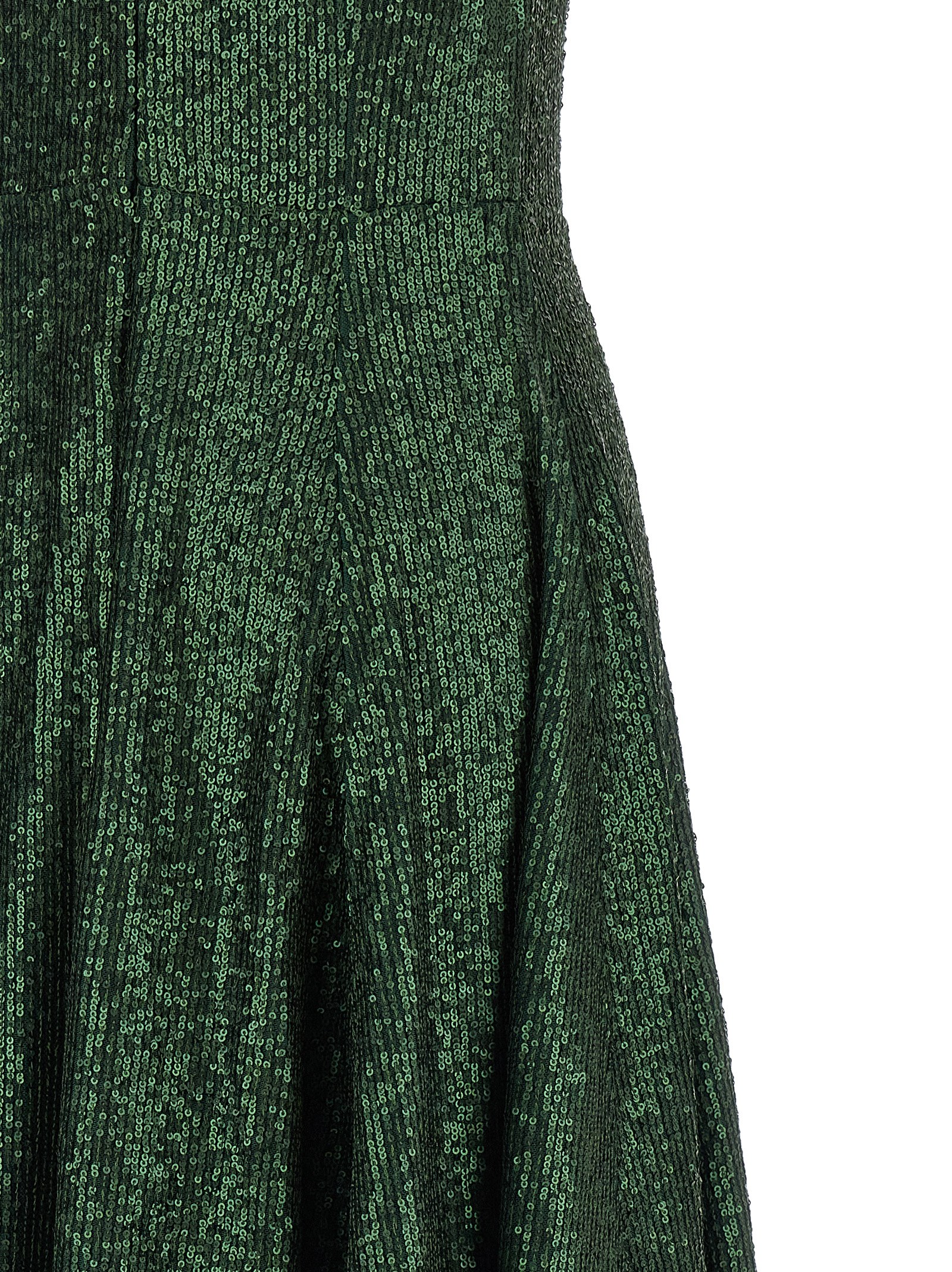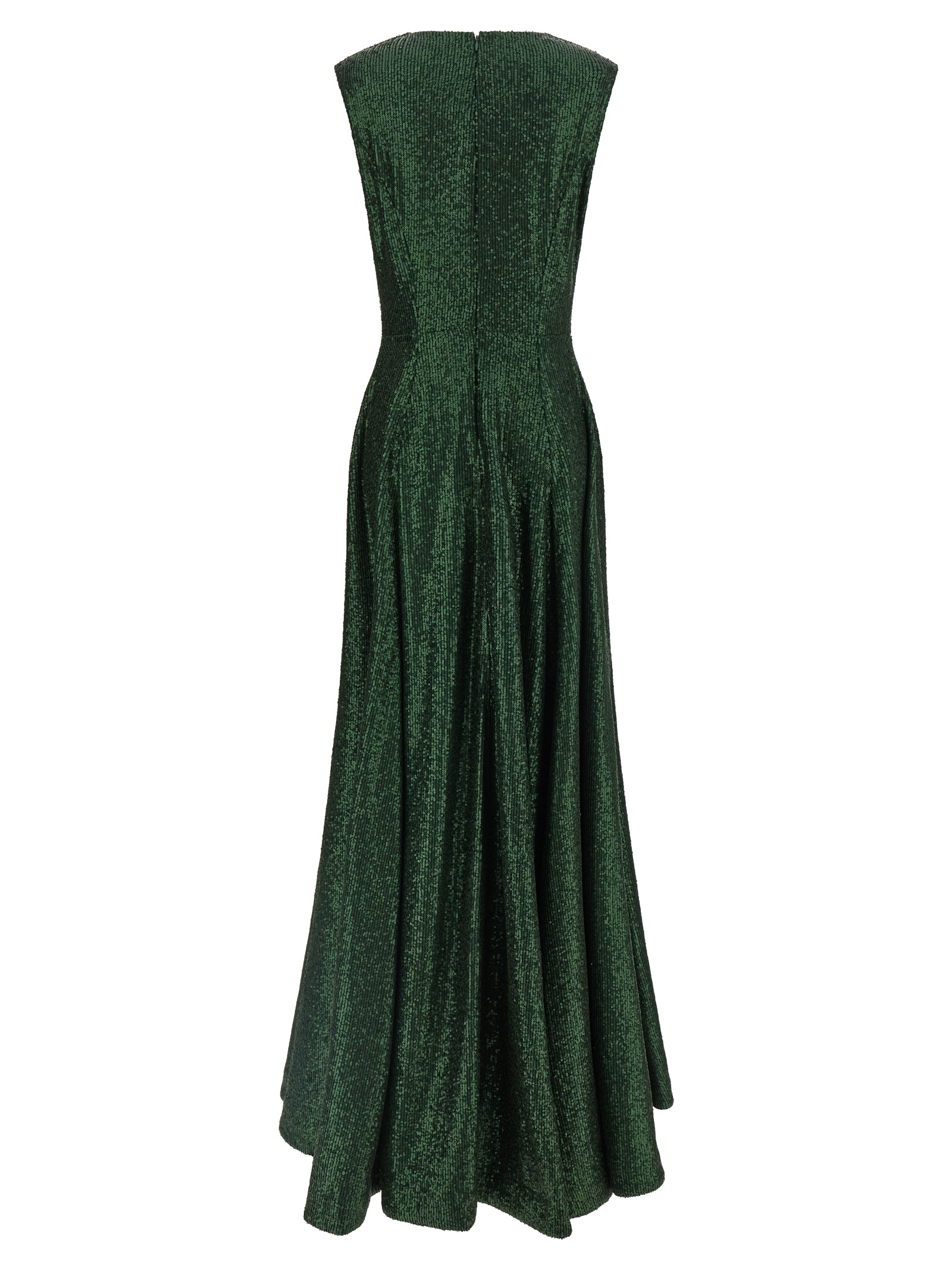 Extra long ‘Grace’ sleeveless dress in fabric with all-over tone-on-tone sequin appliqué, back zip closure, wide skirt with flared silhouette.