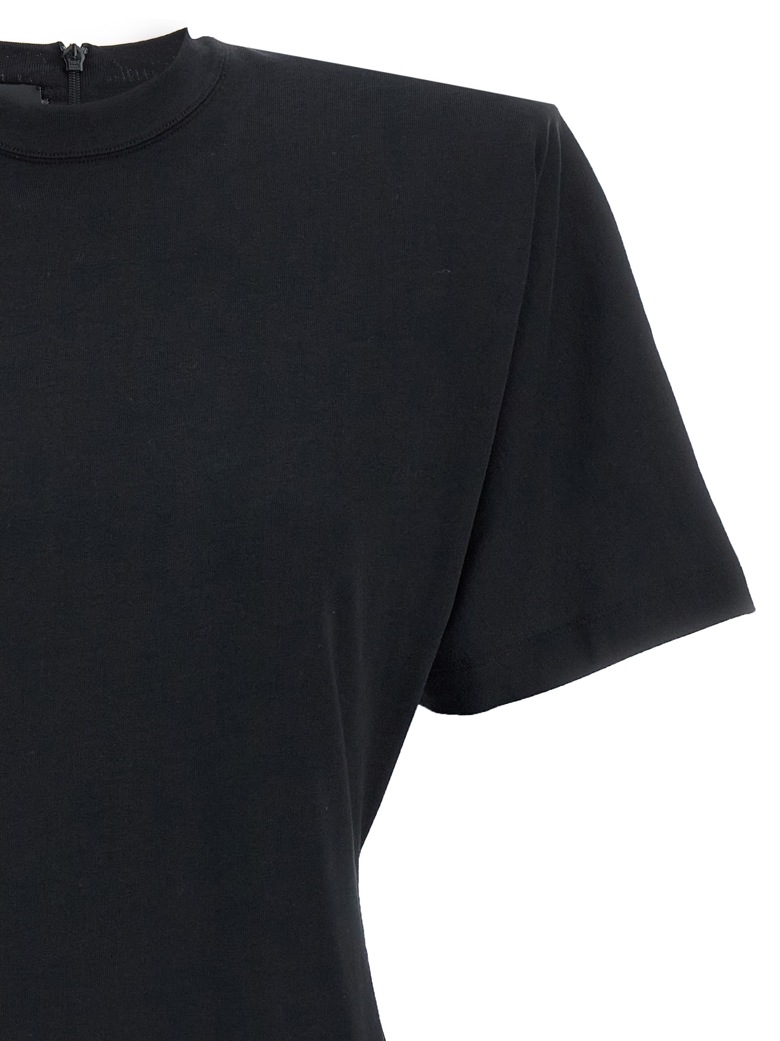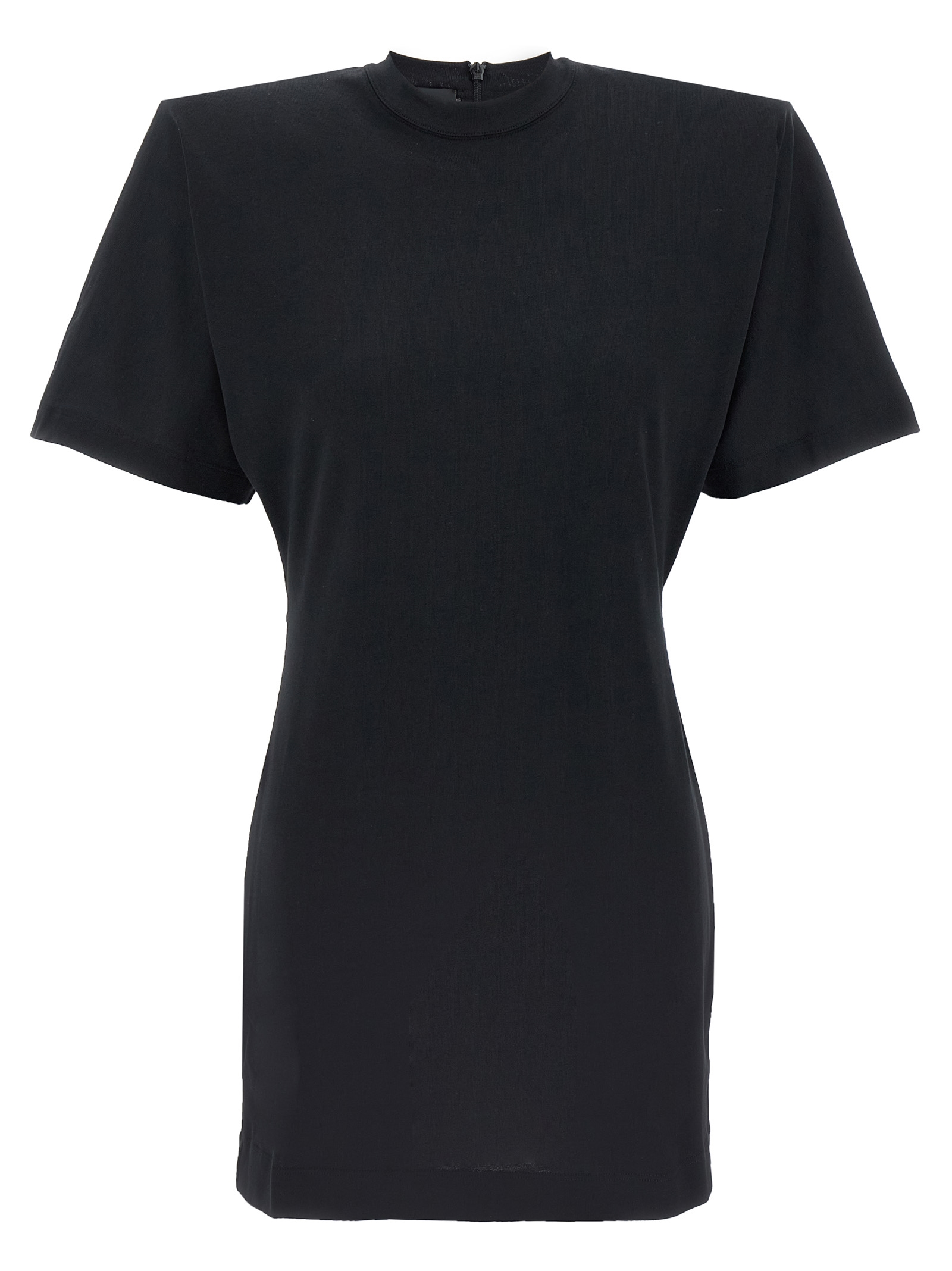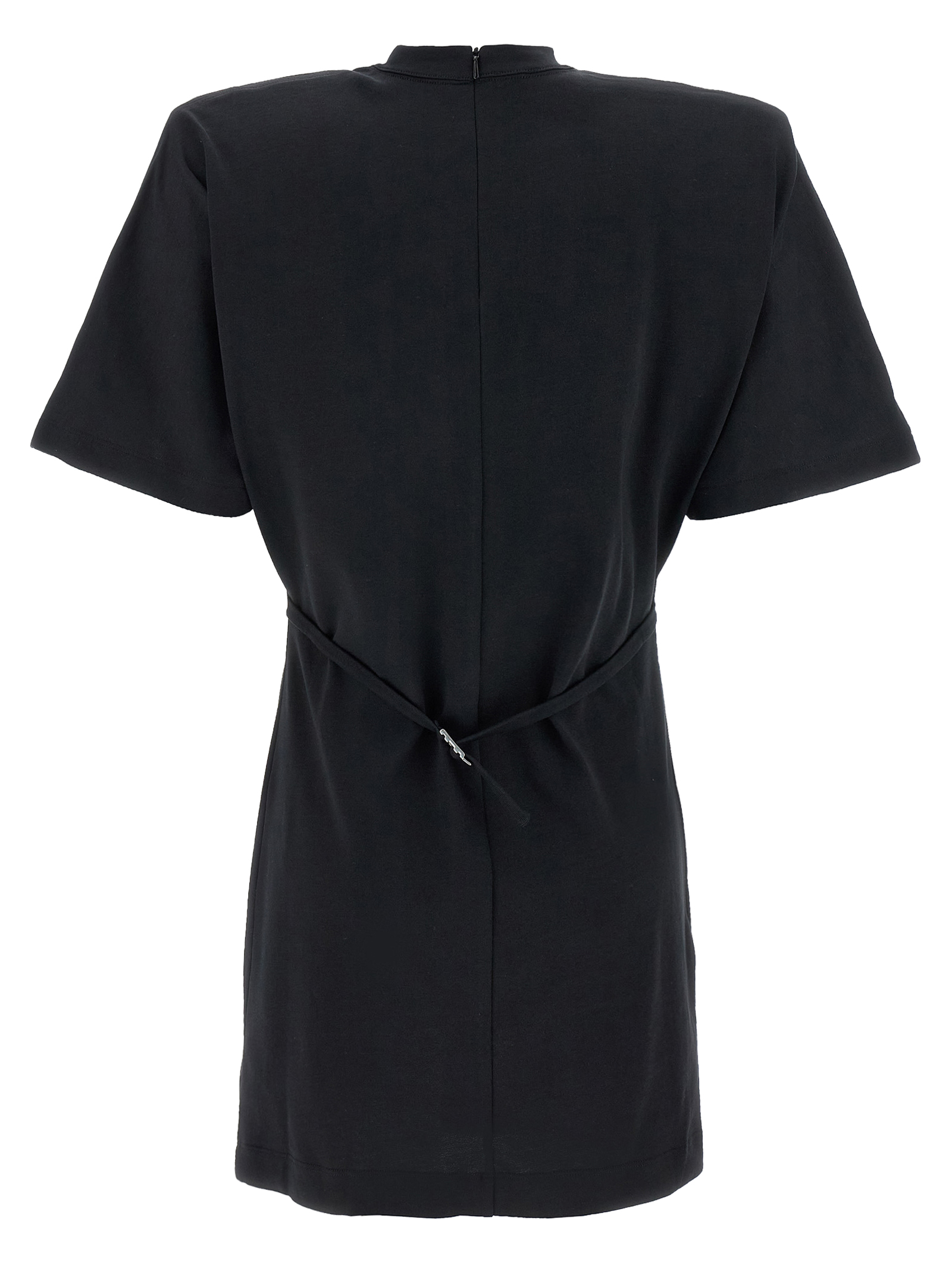 ‘Grady’ pure cotton heavy jersey mini dress with removable extra padded shoulder straps, crew neck, short sleeves, back zip closure, belt.