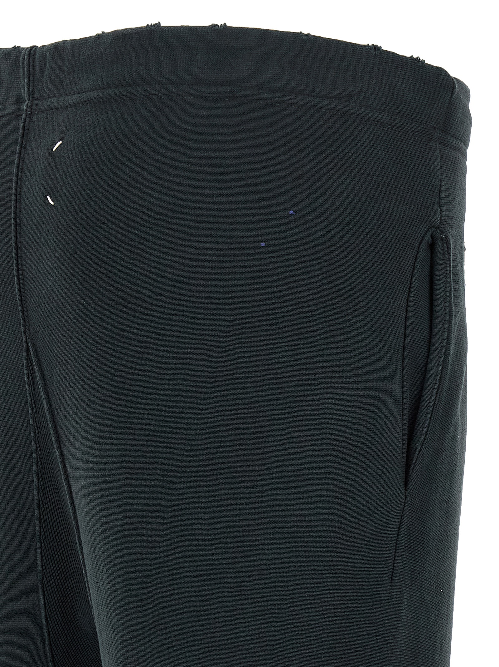 ‘Graffiti’ used-effect cotton jersey joggers with paint stains, adjustable drawstring at the waist, wide leg, ‘Four stitches’ at the back, pockets, split leg bottoms and raw cut hem.