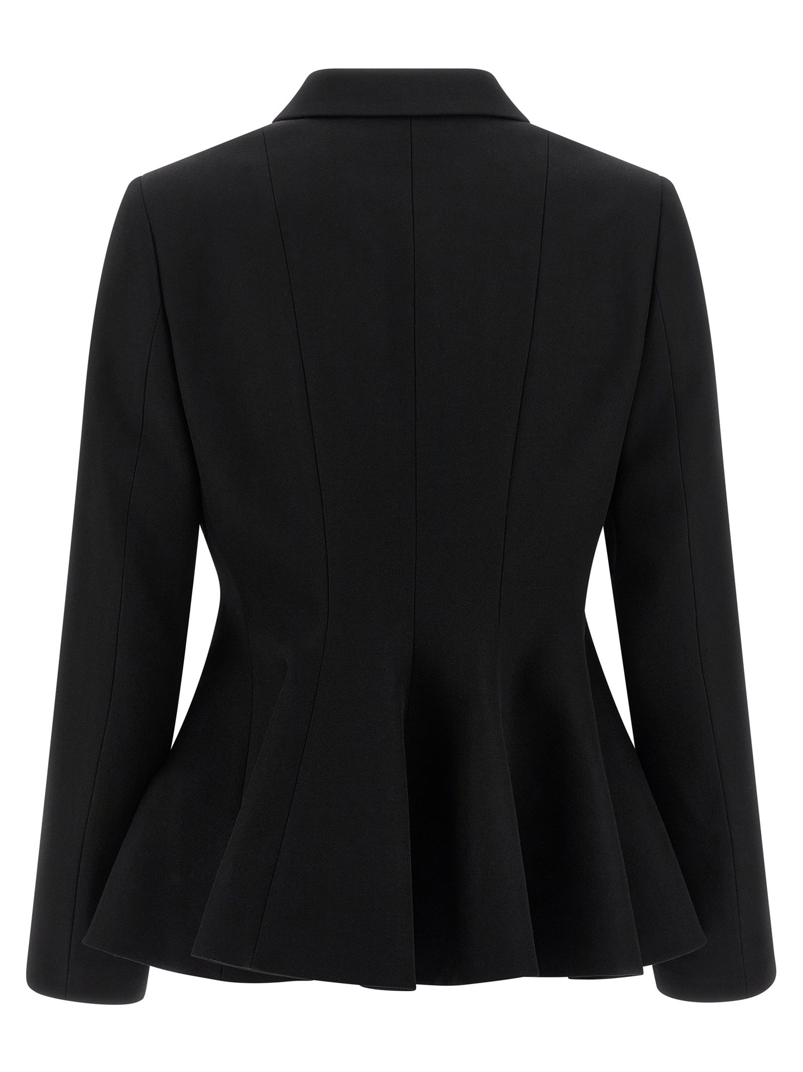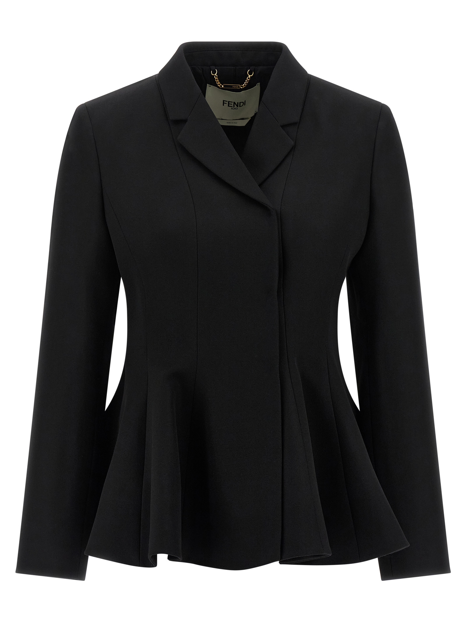 ‘Grain de Poudre’ wool blazer jacket with V-neck with peak lapels, front hook closure, tight waist and wheel length, long sleeves.