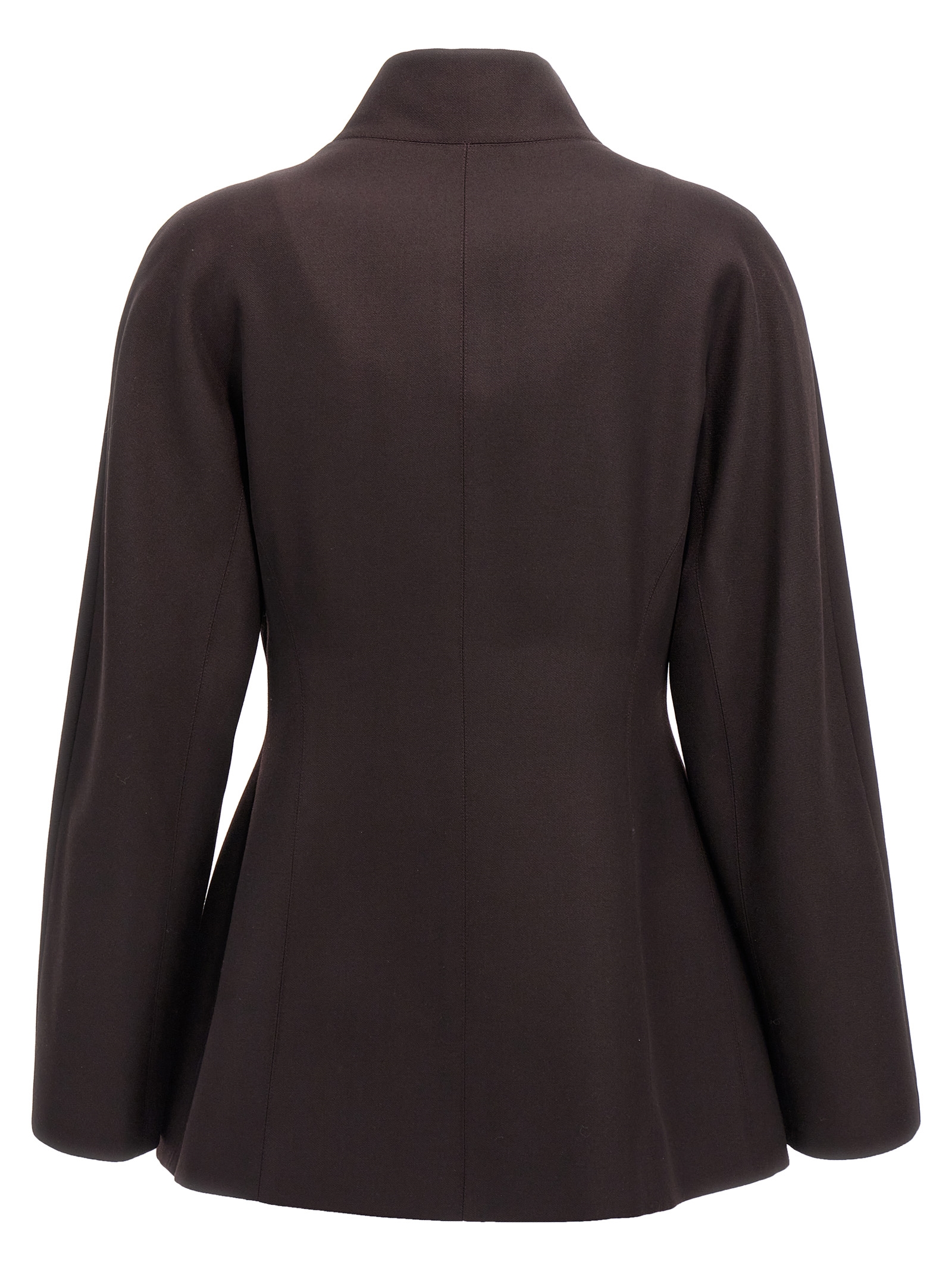 Grain de Poudre wool jacket with concealed hook closure, long kimono sleeves, high neck with raised lapels.