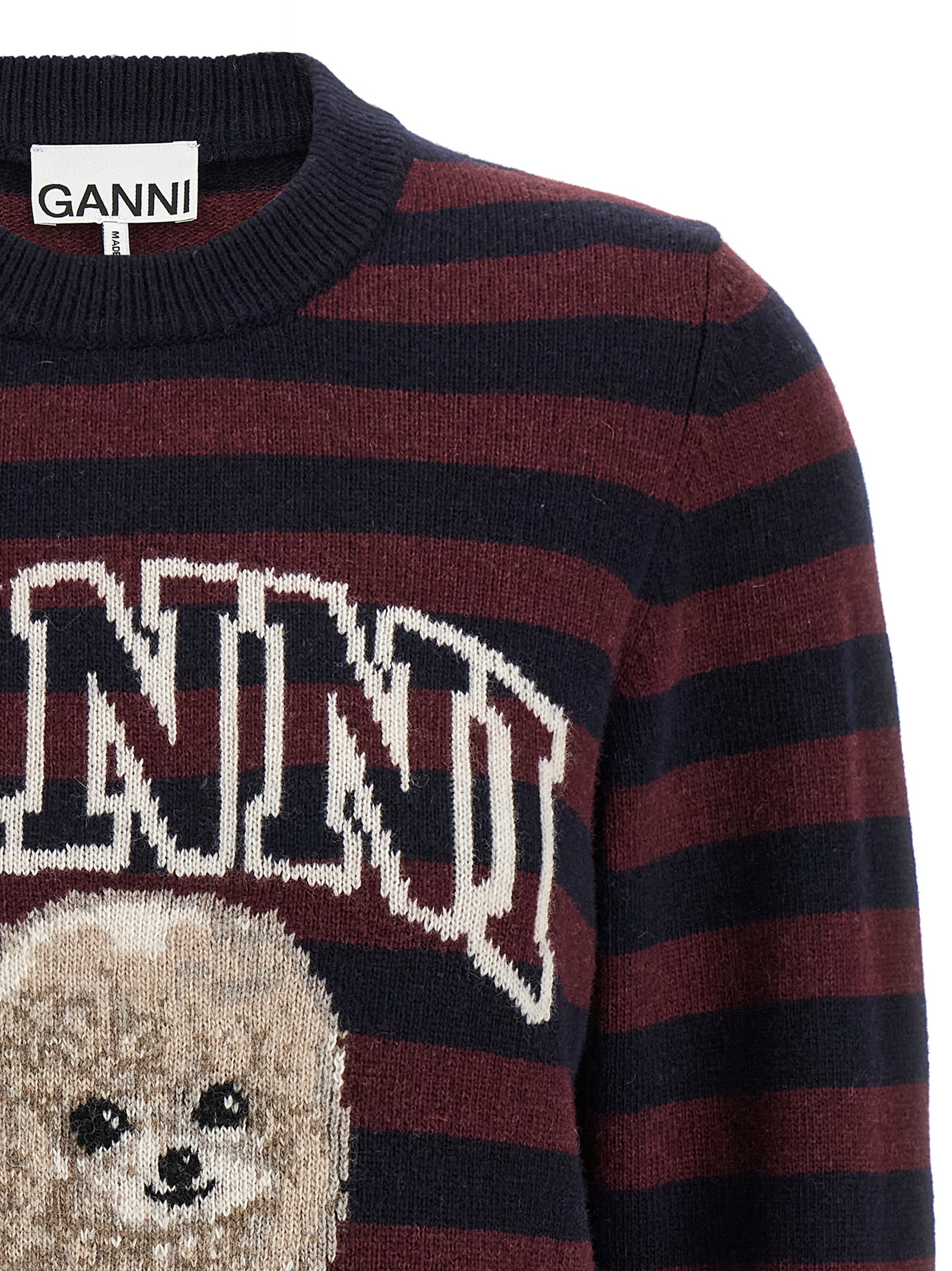 ‘Graphic Wool Mix Poodle Stripe’ striped wool sweater with front jacquard logo, crew neck, long cuffed sleeves.