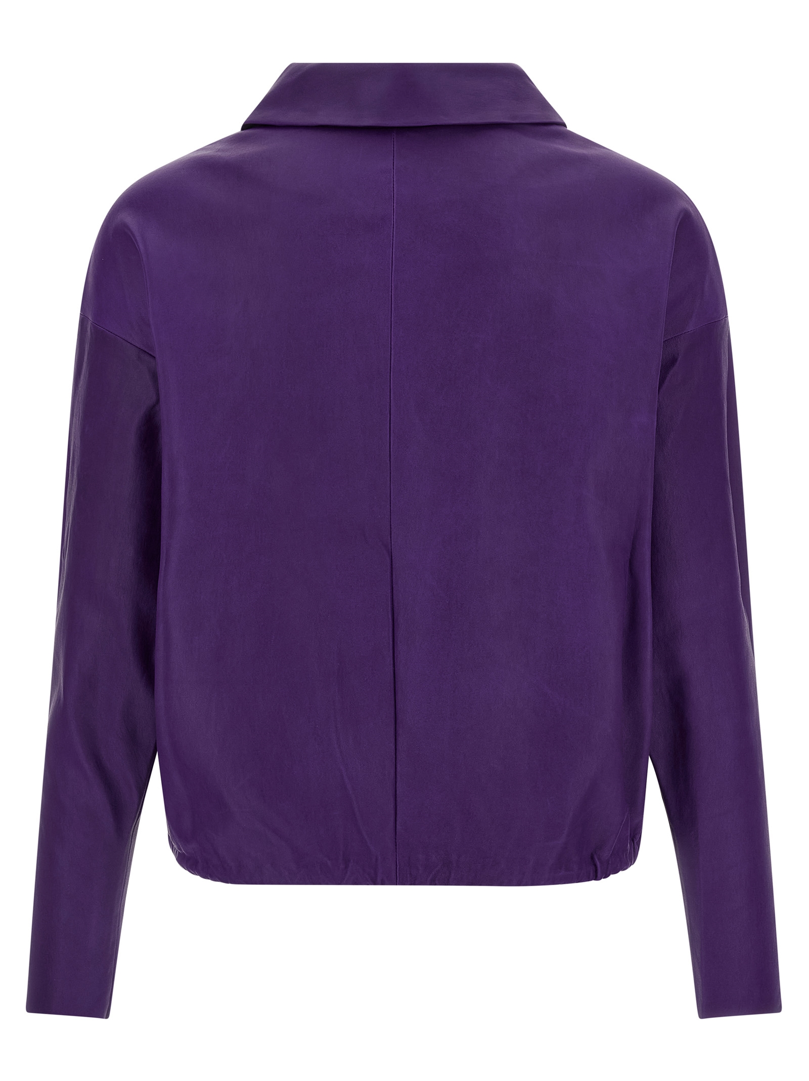 ‘Graziela’ blouse in plongé nappa leather, shirt collar, adjustable V-neck, long sleeves with raw cut hem and dropped shoulder, elastic hem, cotton lining.