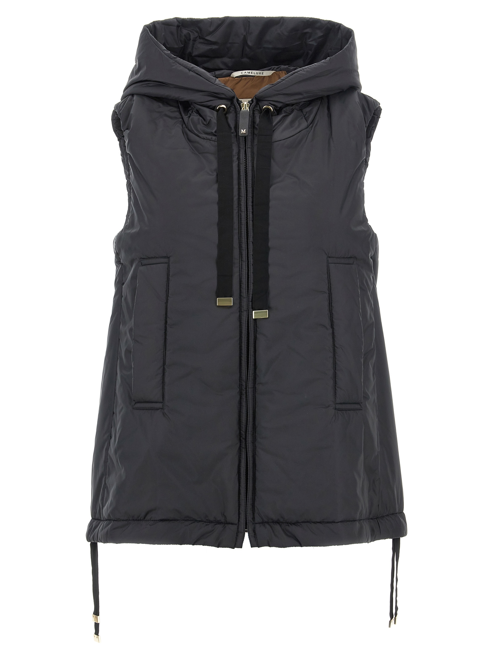 ‘Greengo’ waistcoat in slightly padded Cameluxe waterproof canvas, adjustable hood, top zip closure, pockets, drawstring at the hem.