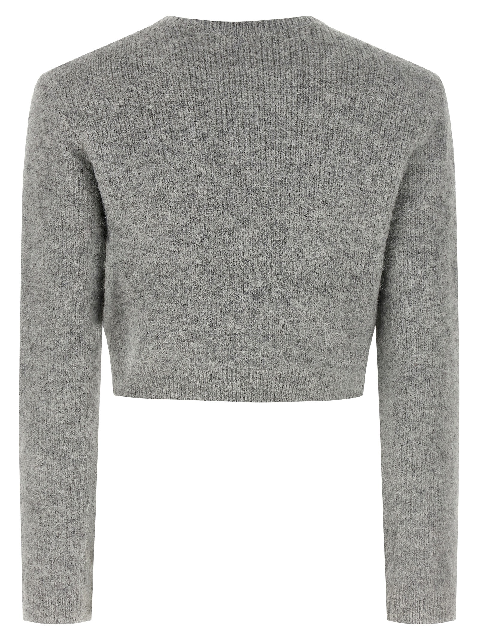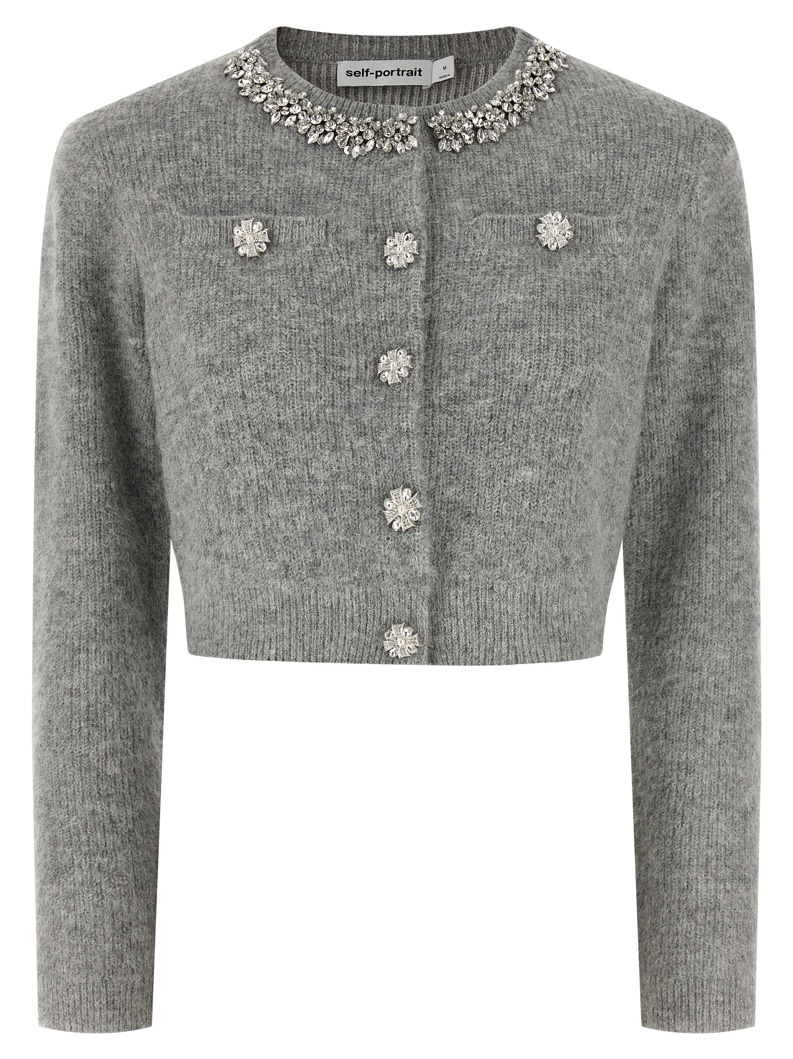 ‘Grey Fluffy Crystal Trim’ cardigan in alpaca and wool blend with fluffy effect lamé threads, crew neck with crystal application, front snap button closure with trompe l’oeil jewel button application, pockets, removable padded shoulder, long cuffed sleeves.