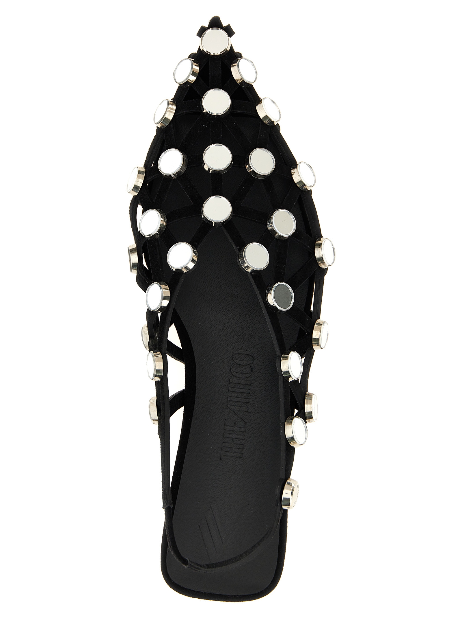 ‘Grid’ suede slingbacks with all-over mirror appliqué, elastic strap, pointed model.