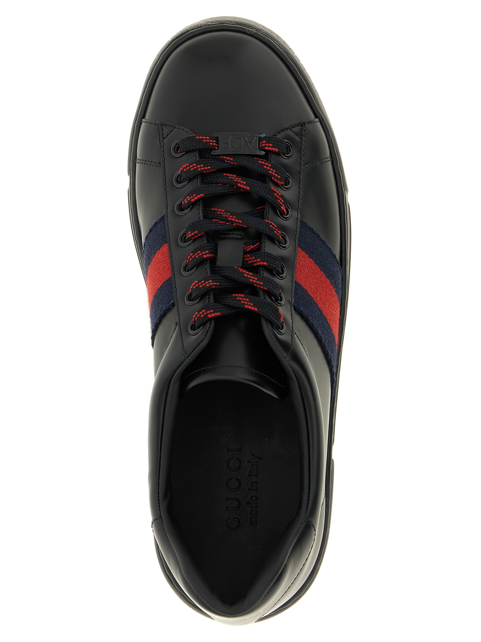 ‘Gucci Ace’ sneakers in shiny smooth leather, lace closure with removable metal ‘Ace’ tag, side Web ribbon, back embossed logo, two-tone rubber sole.