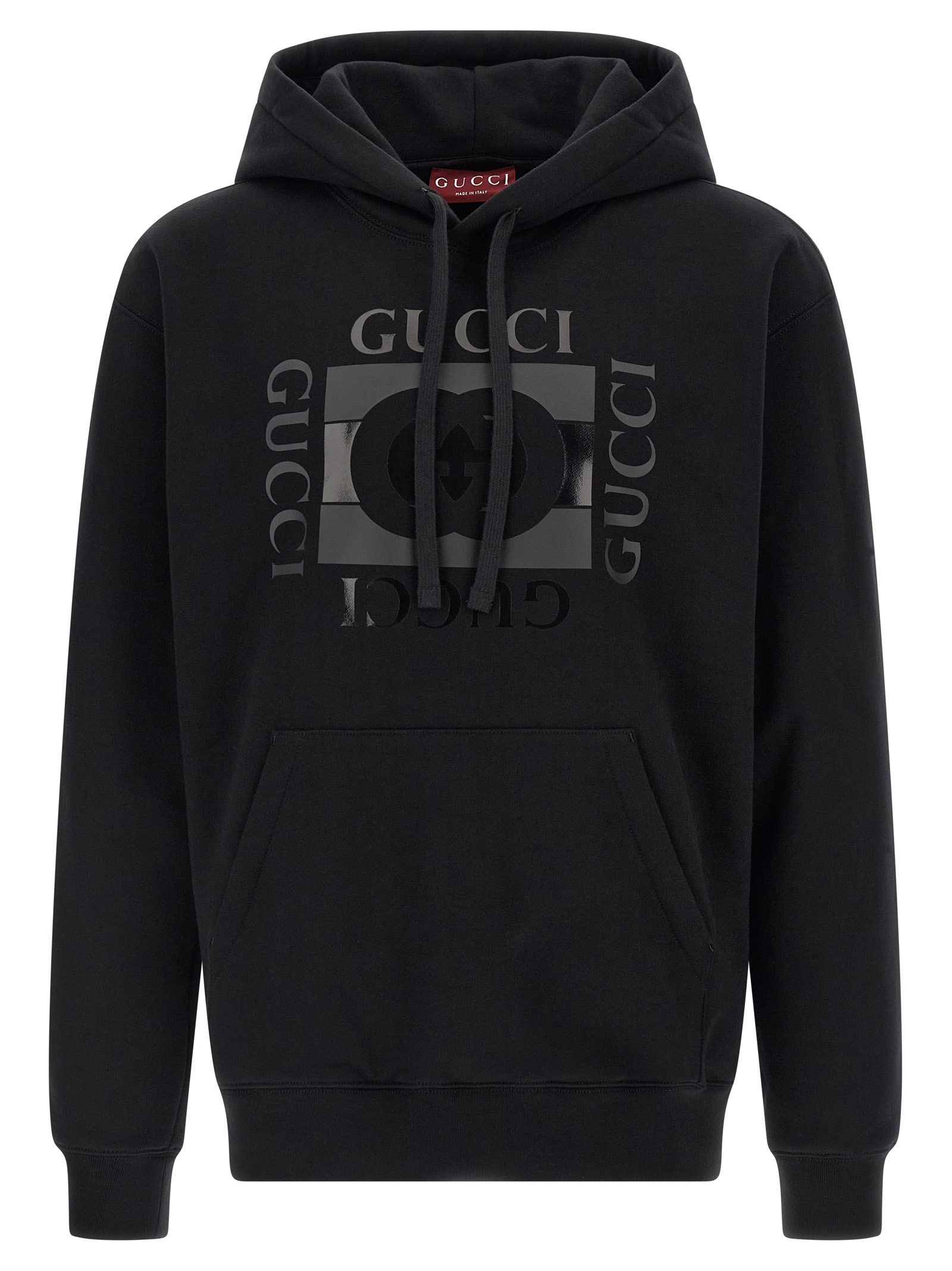 Brushed cotton jersey hoodie with tone-on-tone ‘Gucci Incrocio GG’ print on the front, kangaroo pocket, long sleeves with cuffs and dropped shoulders, and headband.