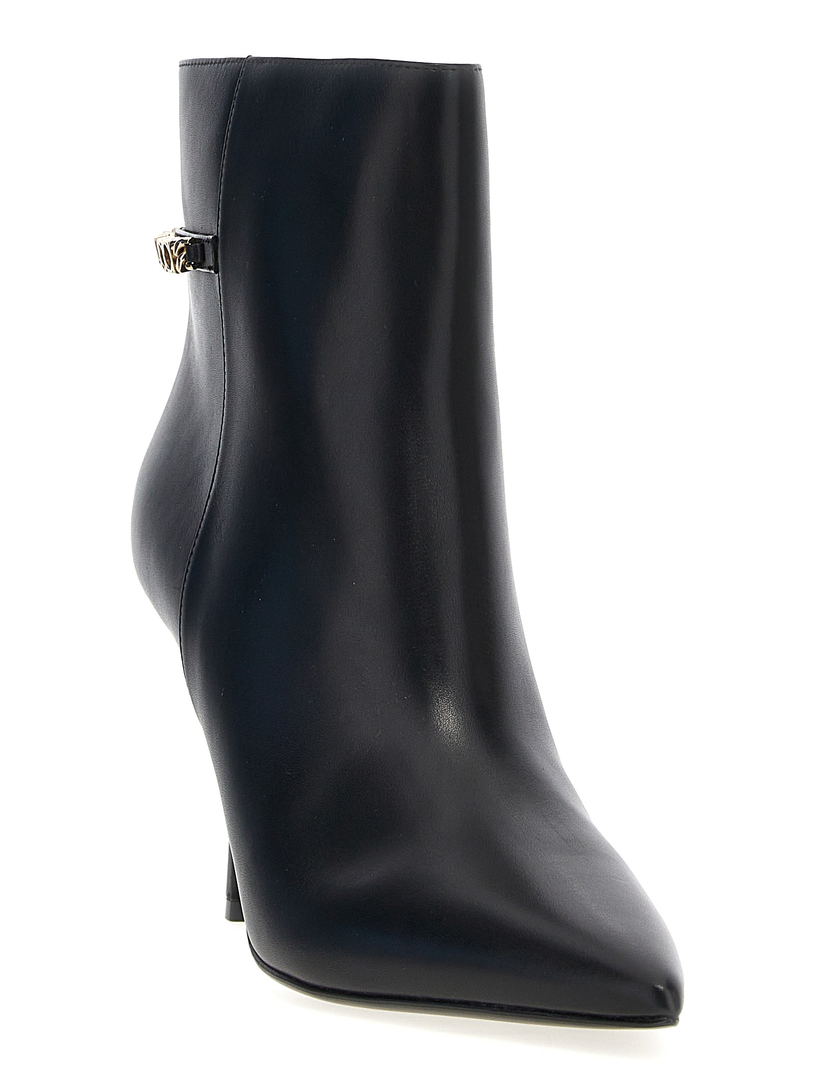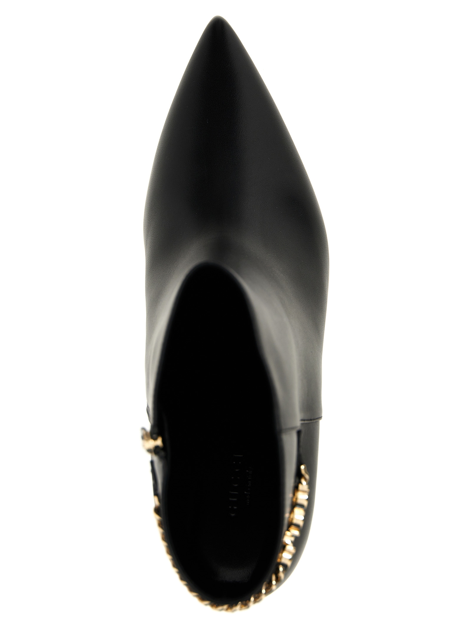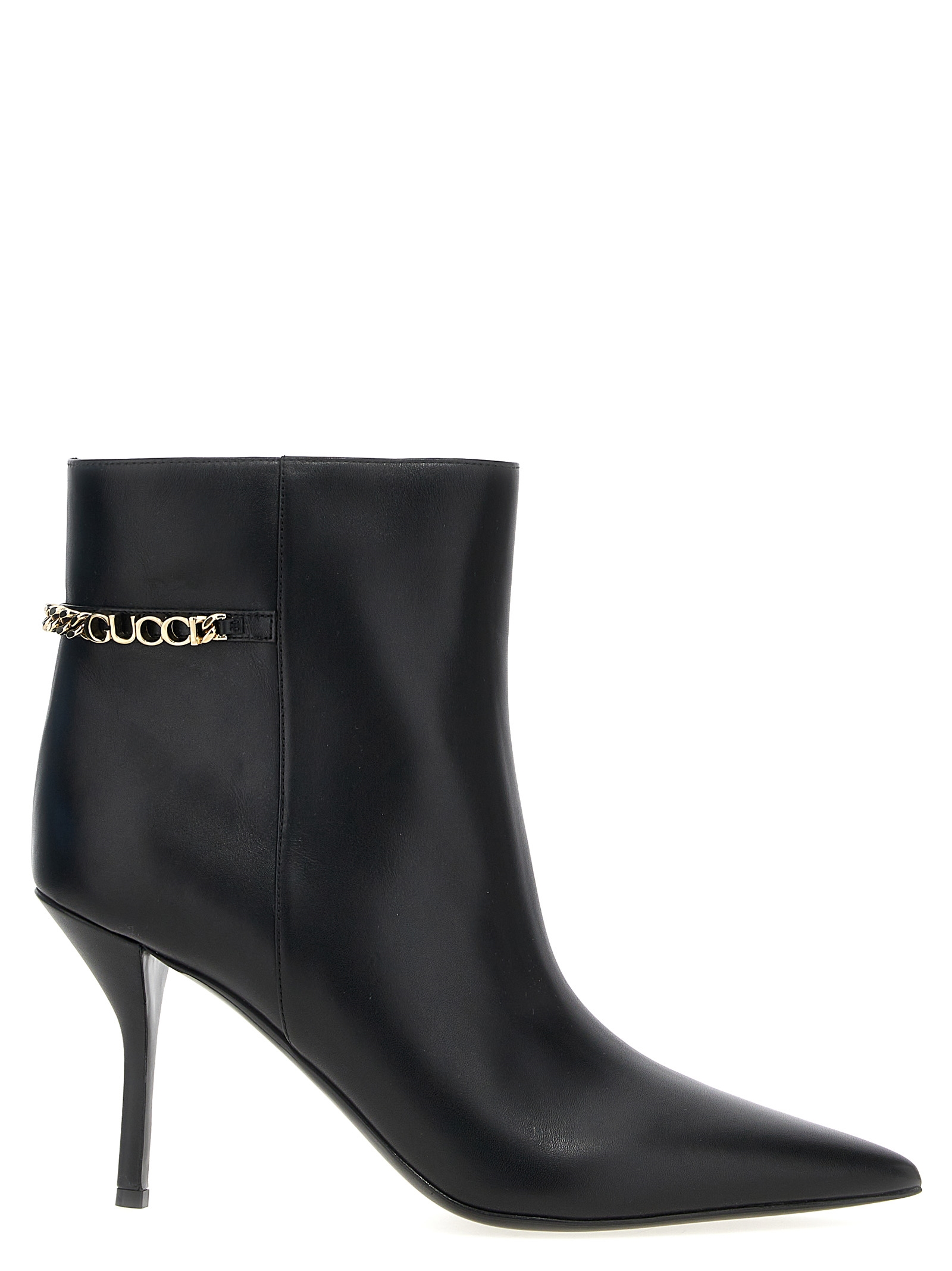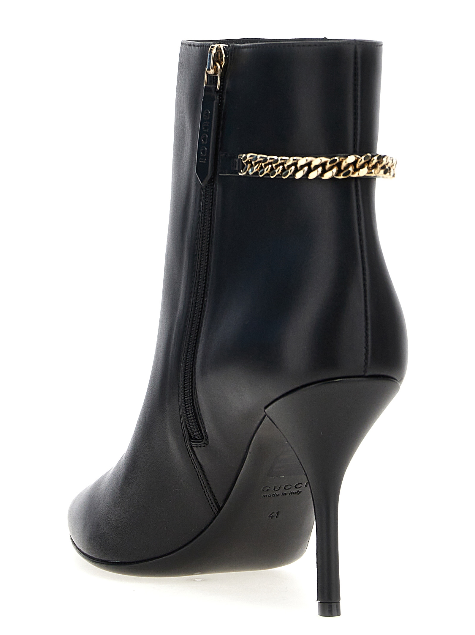‘Gucci Signoria’ leather ankle boots with gold metal chain detail and logo, side zip closure, heel.