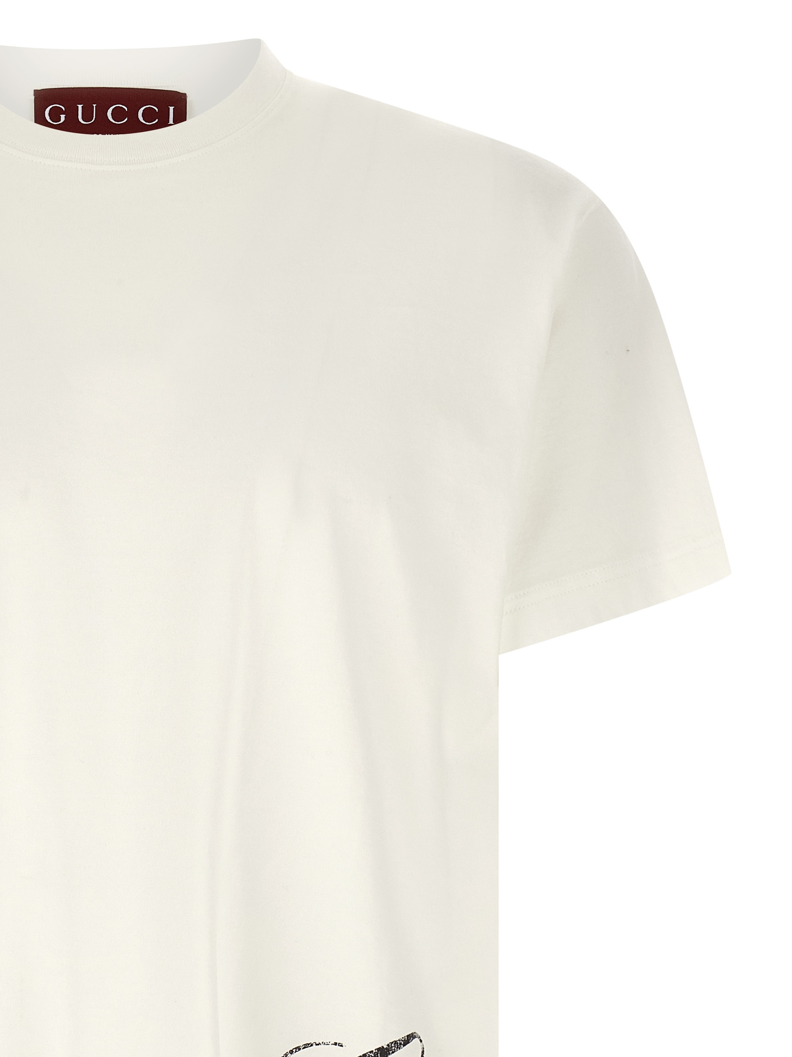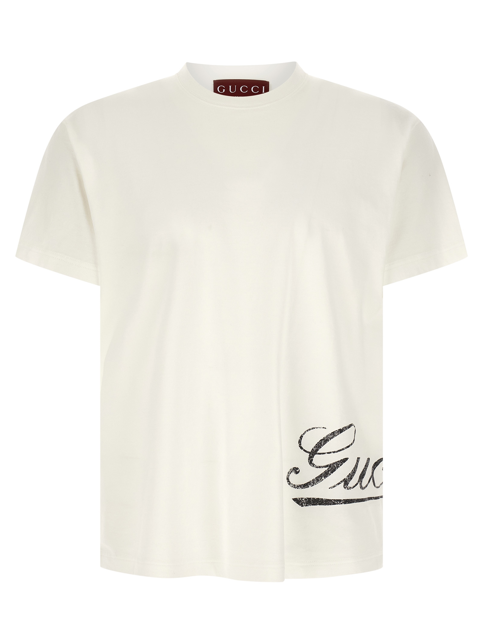 ‘Gucci’ vintage-effect logo print, crew neck, short sleeves with dropped shoulders.