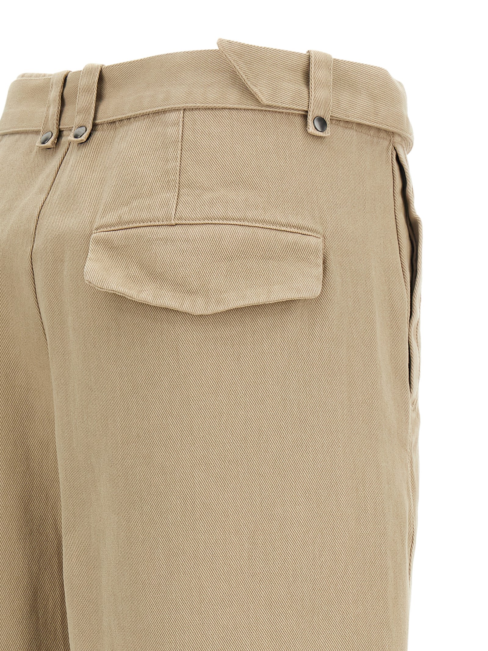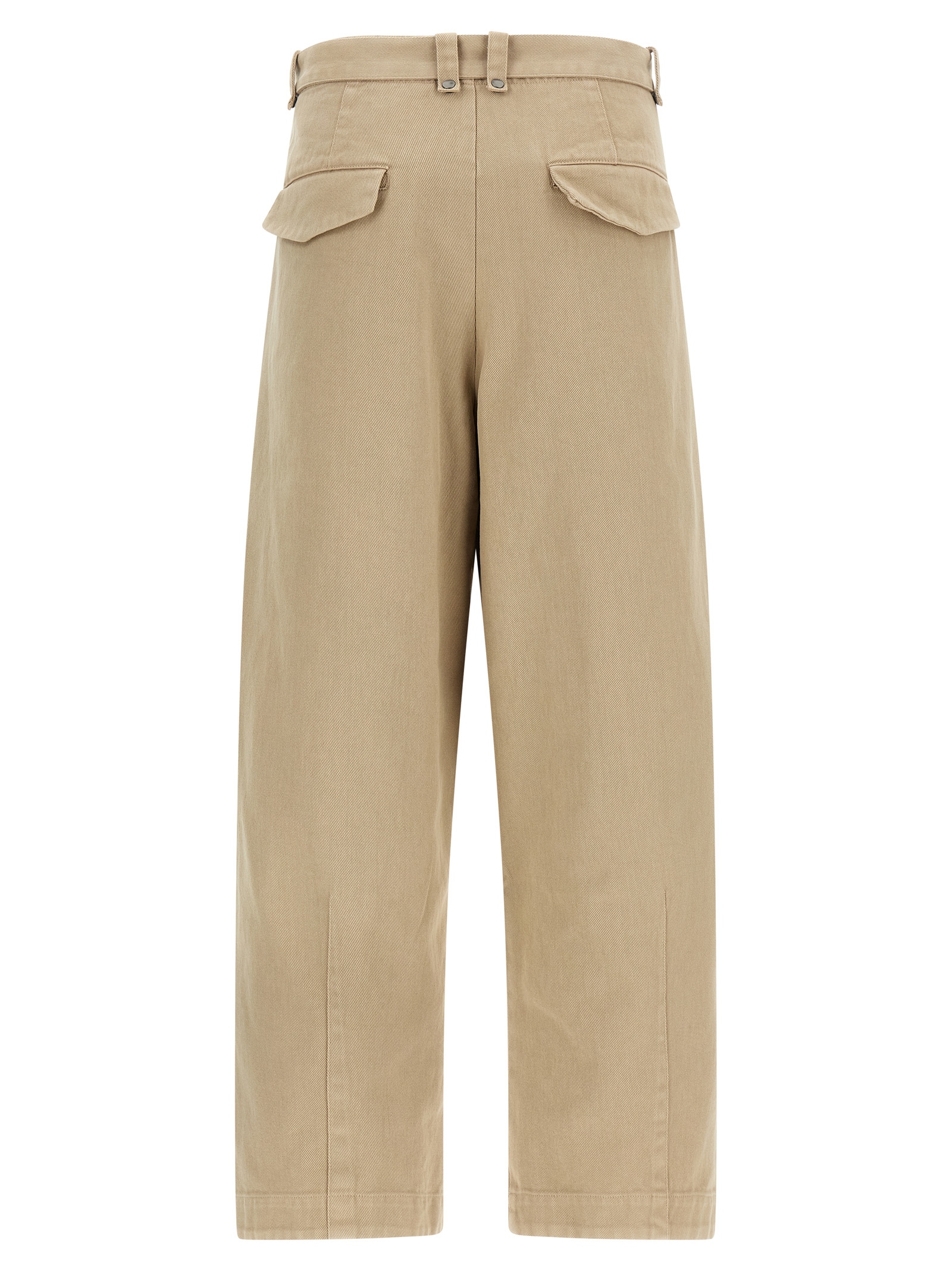 ‘Gully’ baggy cotton canvas trousers with regular waist and pin tucks on the leg bottom, side and back pockets, front zip and hook closure and removable and adjustable matching waist belt with metal buckle.
