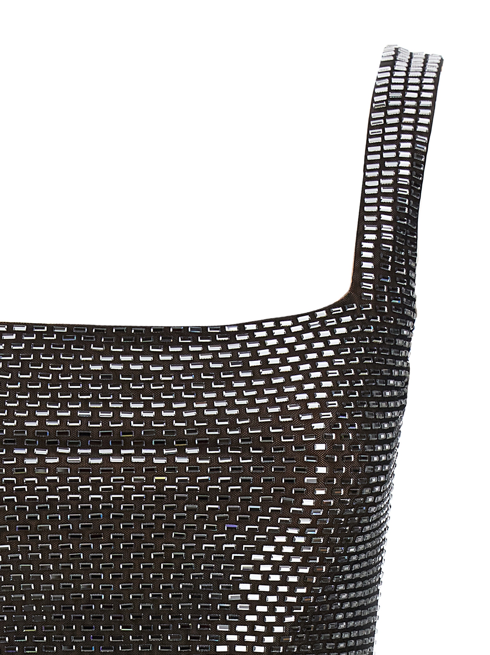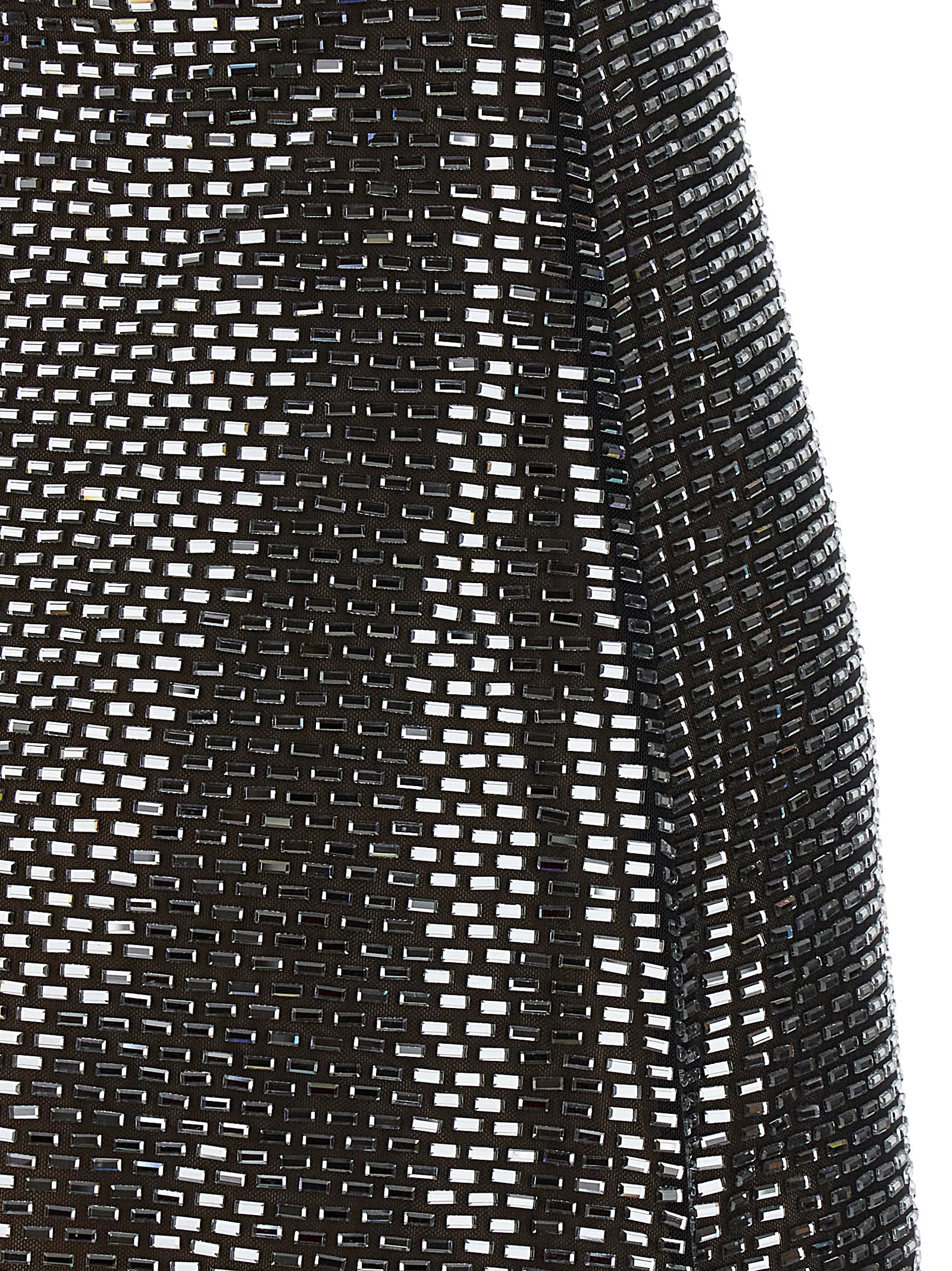 Gunmetal Rhinestone Mesh Mini’ mesh knit dress with all-over baguette crystal appliquรฉ, sleeveless square neckline at the front and back, hourglass silhouette with flared skirt, front split, back zip closure, lining.