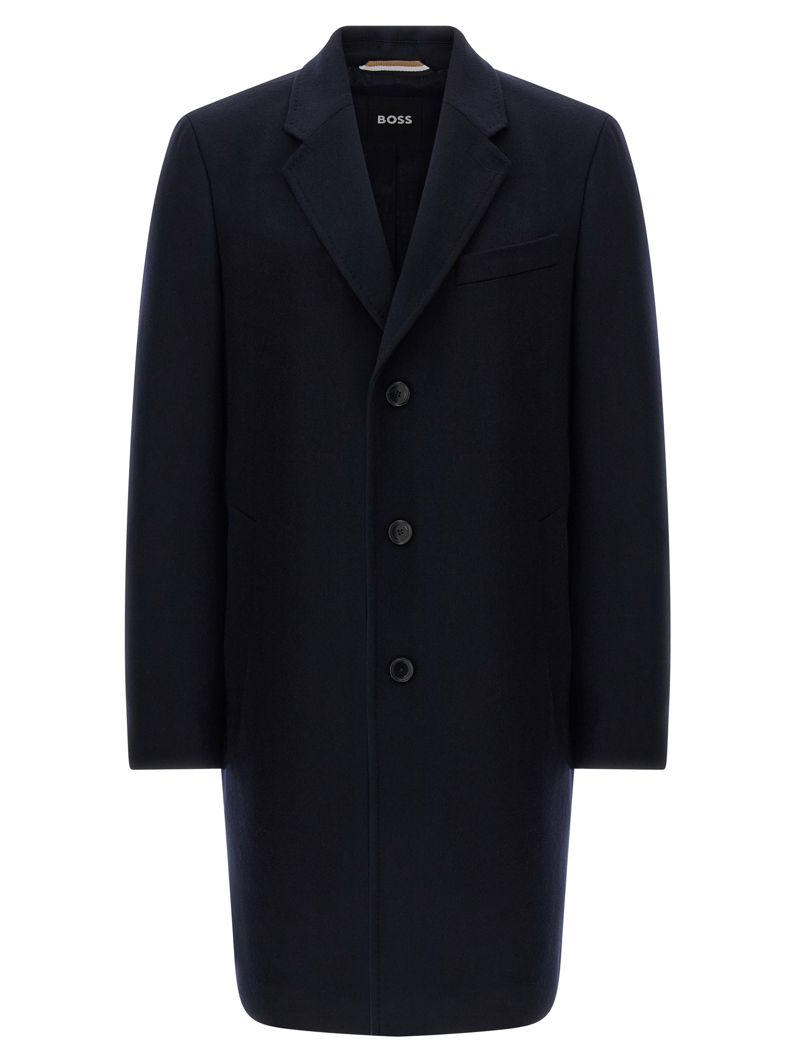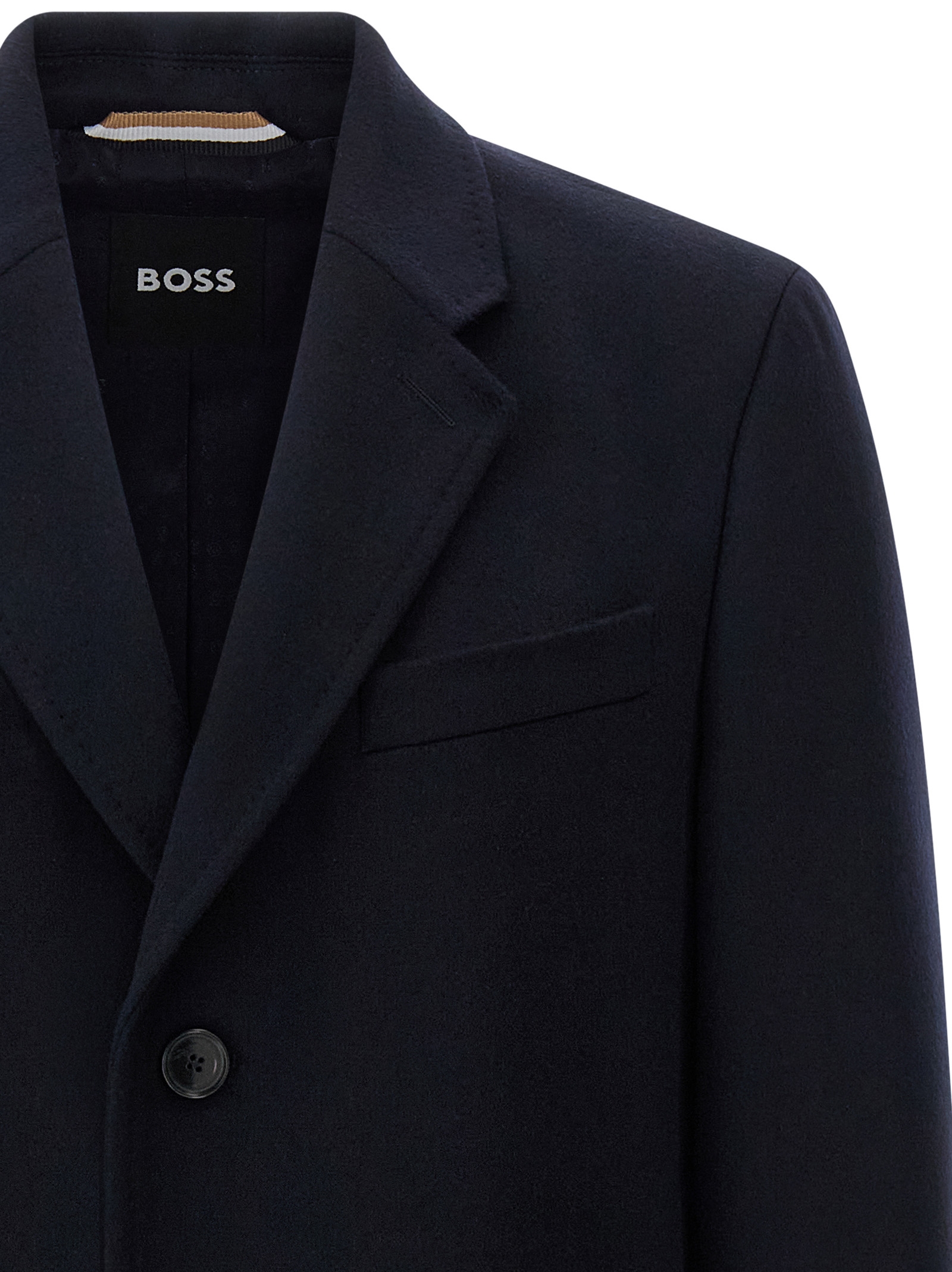 Single-breasted ‘H-Hyde-254’ blend wool and cashmere coat with front button closure, lapel collar, breast pocket, welt pockets, structured shoulder strap, long sleeves, back split, and monogram viscose lining.