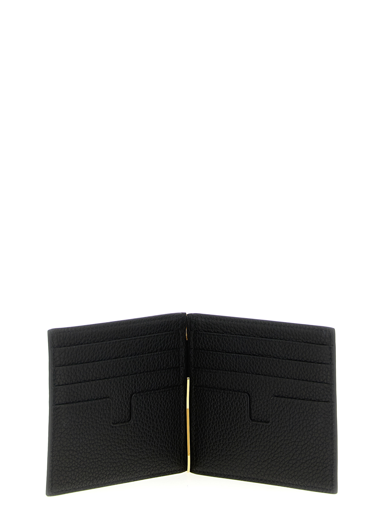 Hammered leather card holder with money clip, front logo print and gold trim.