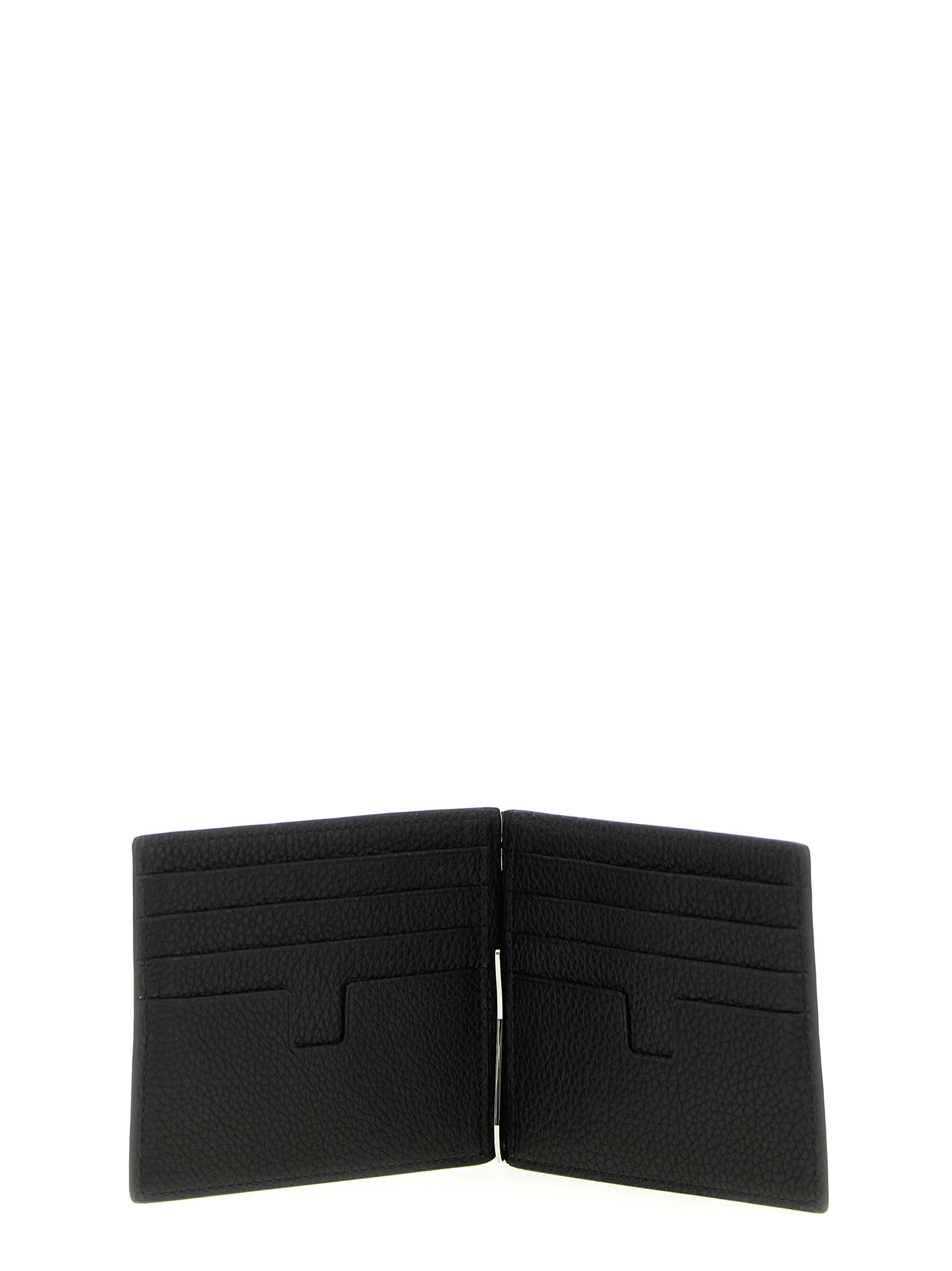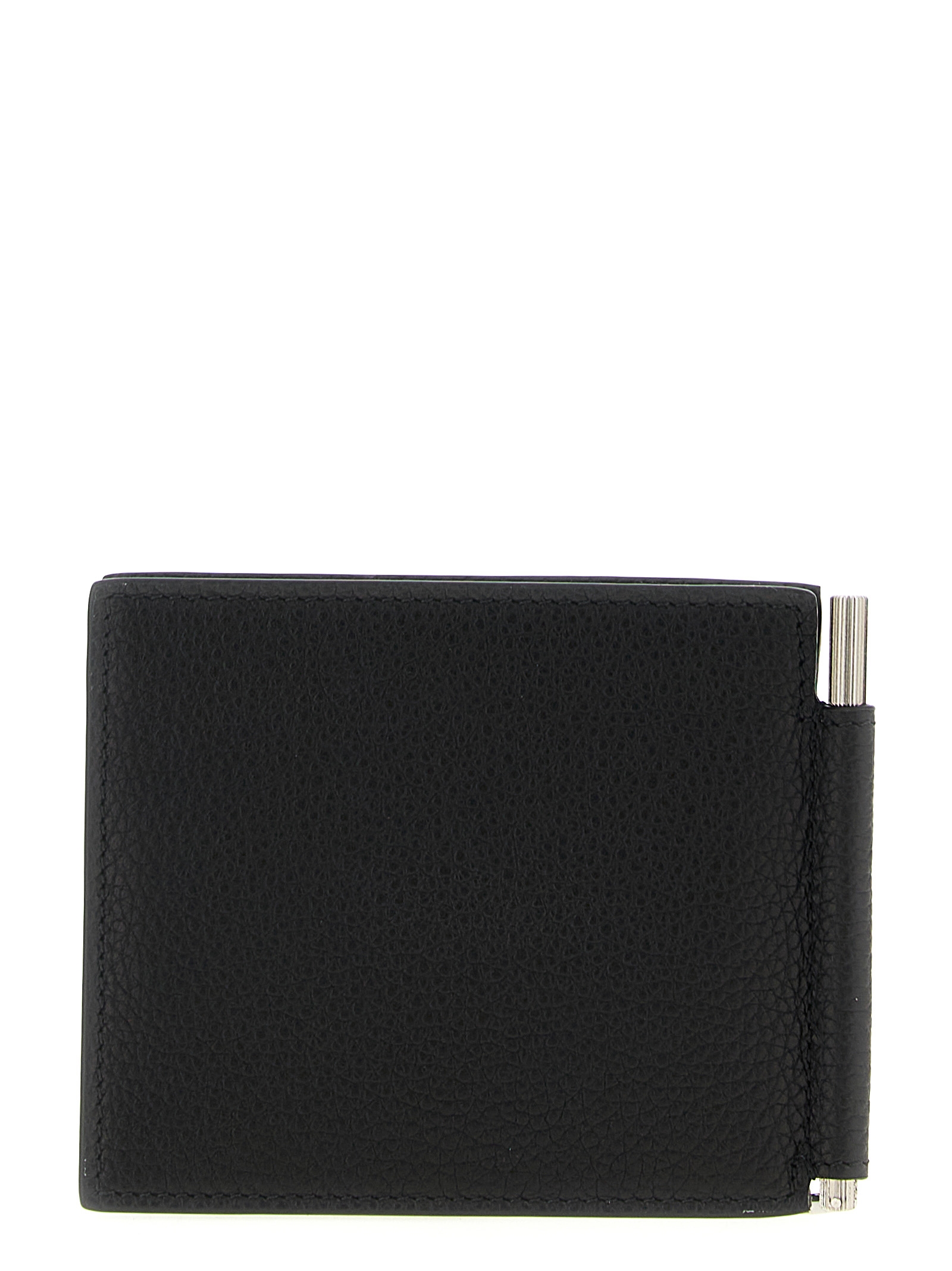 Hammered leather card holder with money clip, front logo print and silver trim.