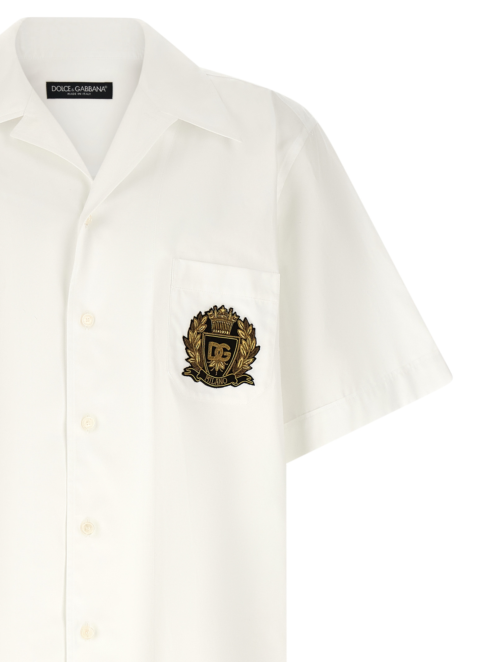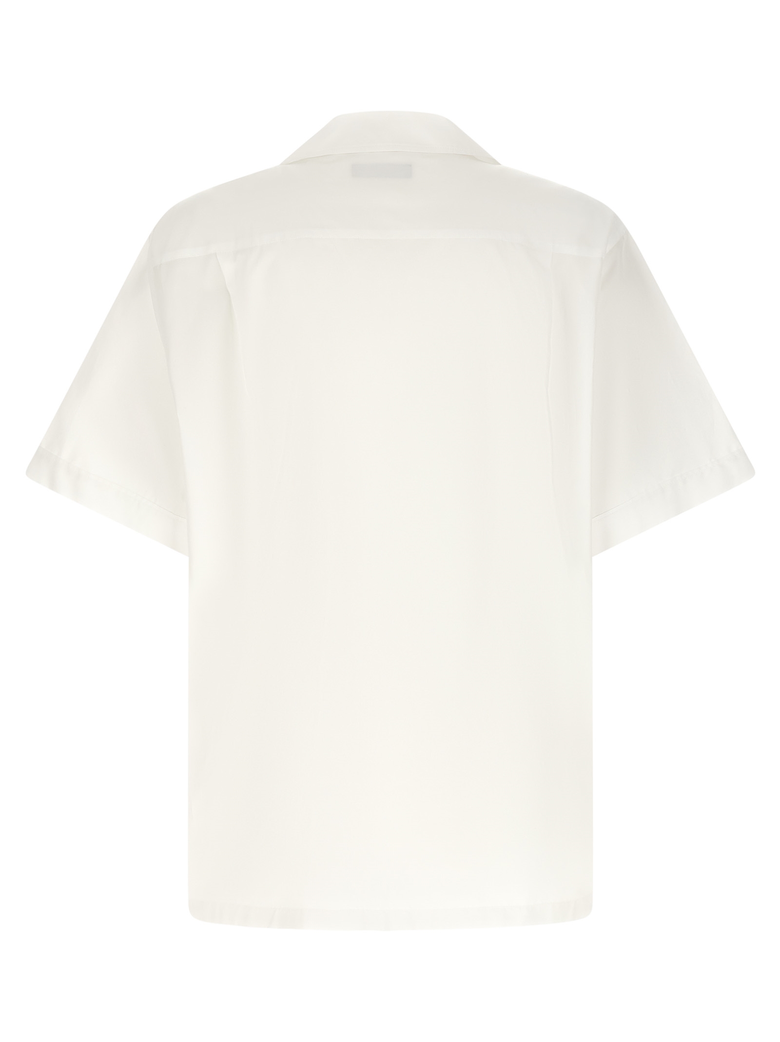 ‘Hawaii’ cotton poplin shirt, breast pocket with heraldic patch, front button closure, short cuffed sleeves, side slits, asymmetric hem.
