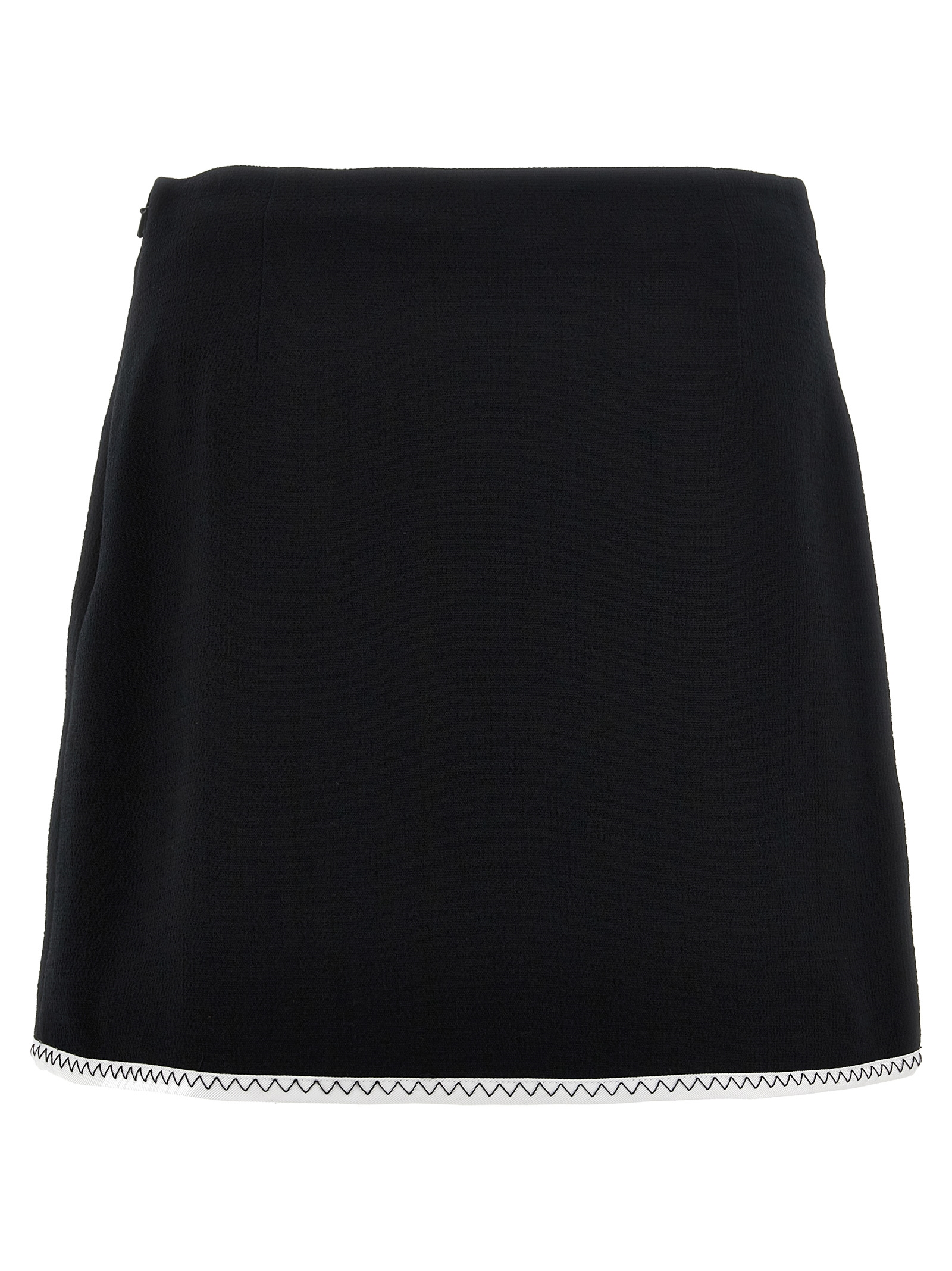 Viscose blend crepe skirt, front pockets with heart-shaped buttons, side zip closure, contrast grosgrain hem.