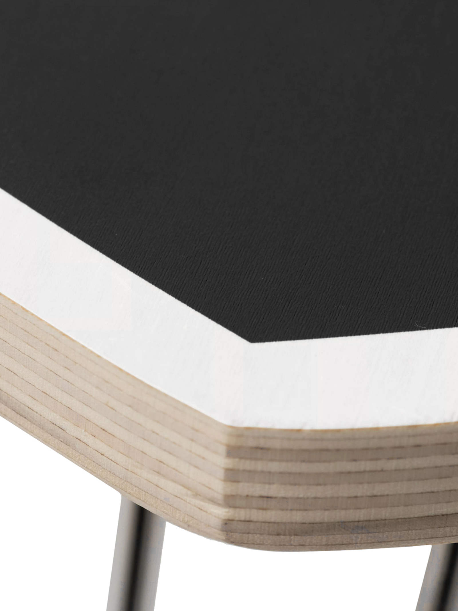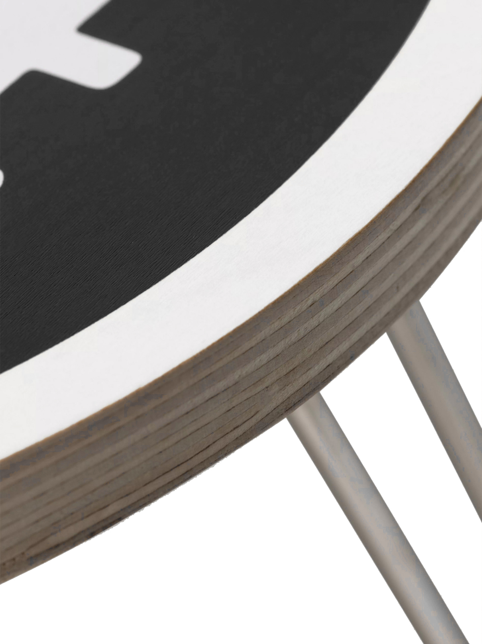 ‘Heart’ birch plywood coffee table with graphic print on the surface, folding iron legs.