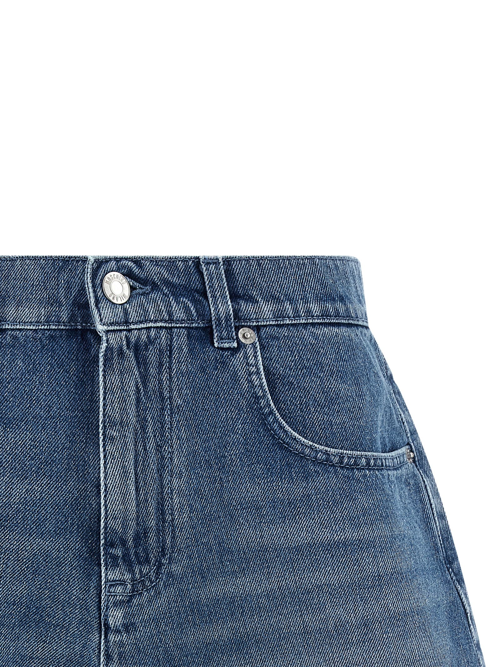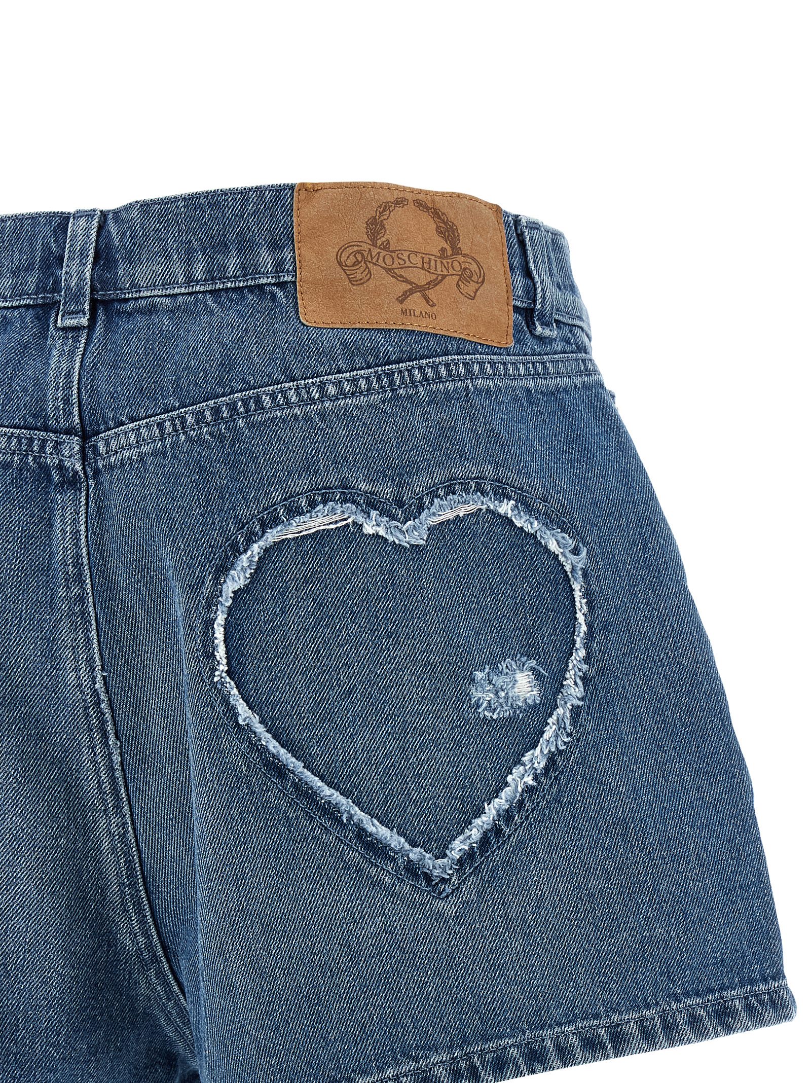Stone-washed cotton denim shorts with used-effect ‘Heart’ detail with fringed edges and back logo tag, zip and front button closure, five pockets.