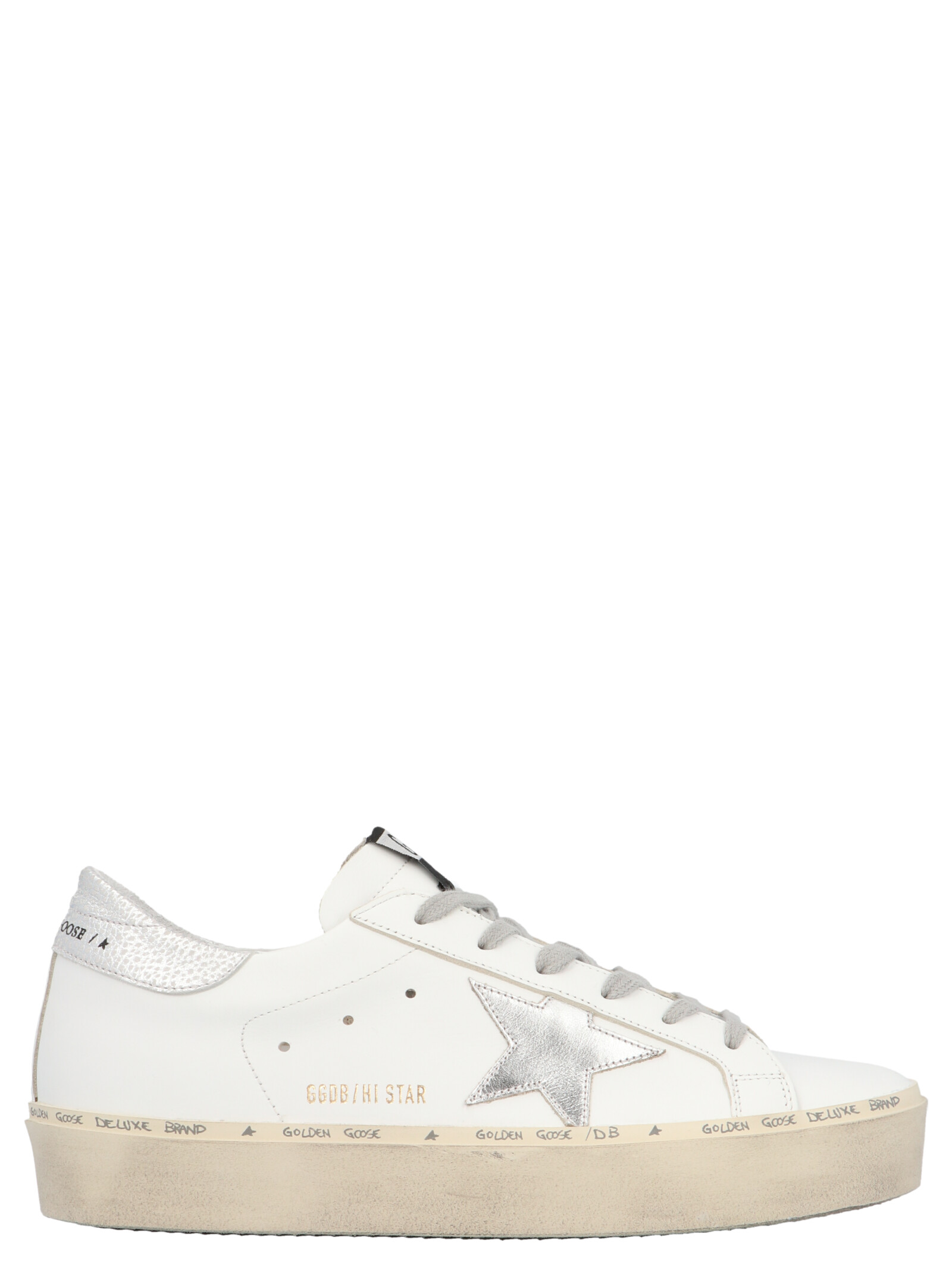 Golden Goose ‘Hi-Star’ leather sneakers featuring a star on the side, a silver metallic heel, and a contrasting logo print between the sole and upper.