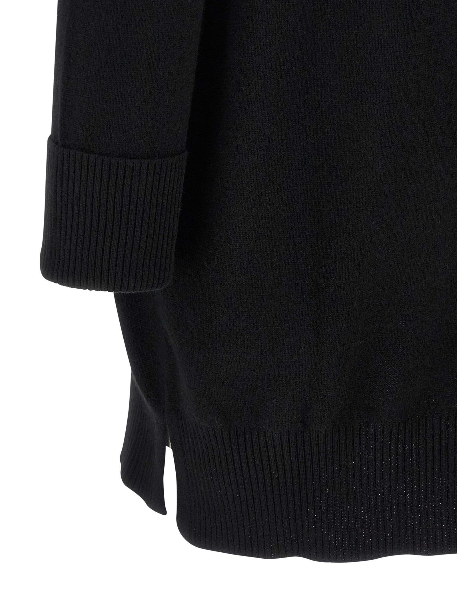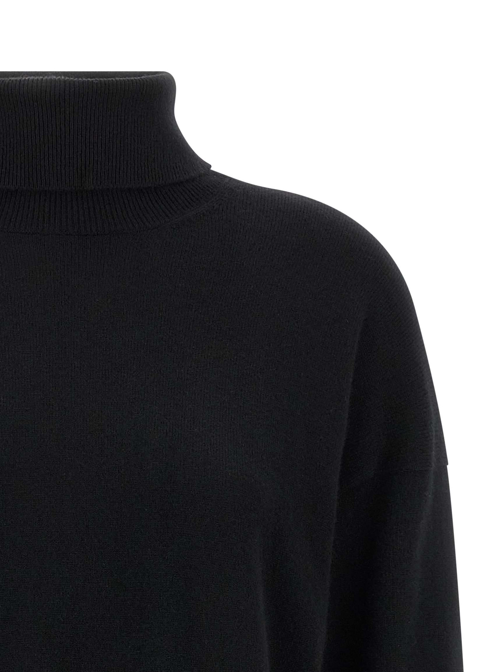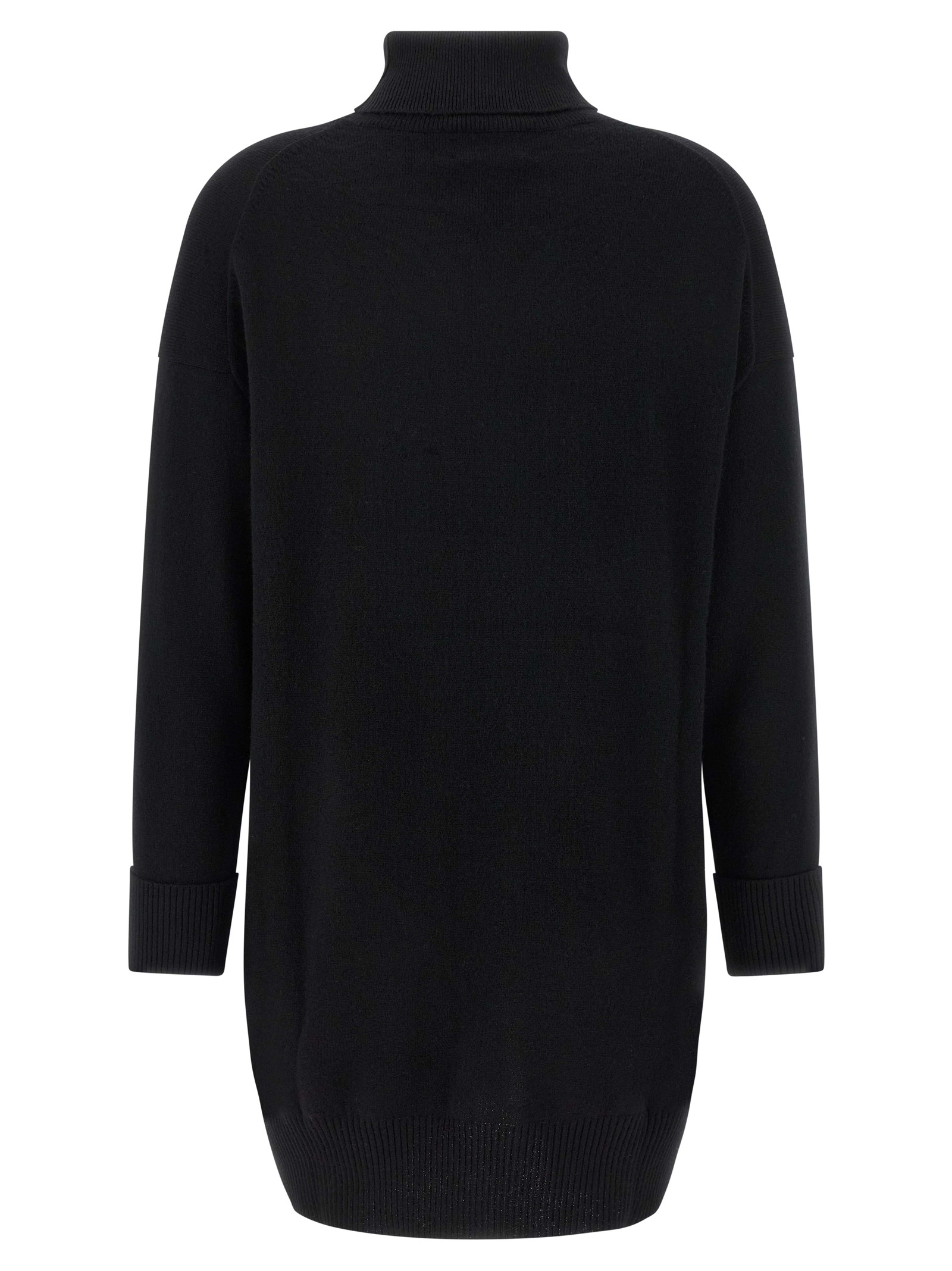 Cashmere mini dress, turned-up high neck, long sleeves with turned-up cuffs and dropped shoulder, side slits.
