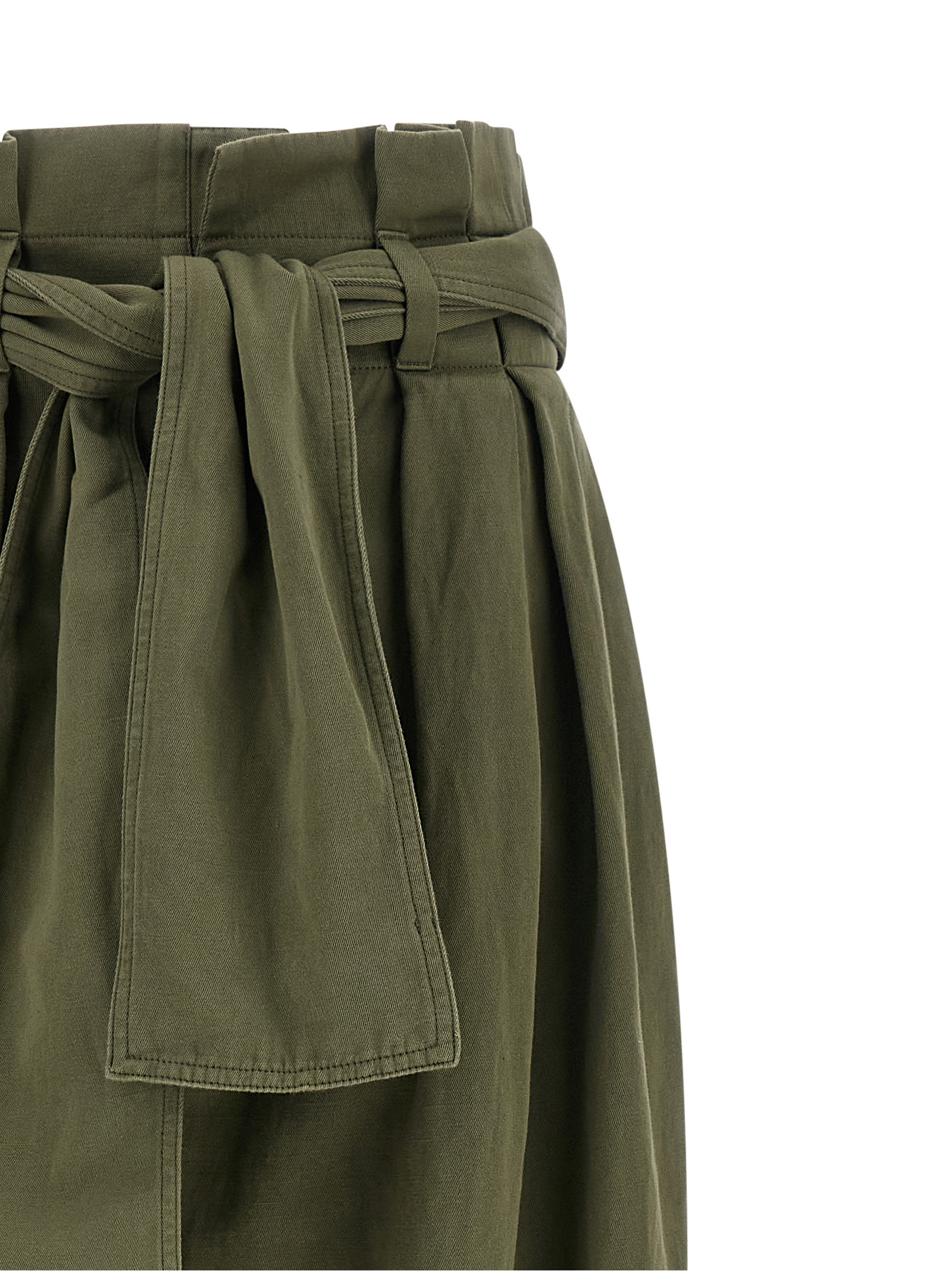 Serge pants, extra wide and tapered leg, bag model with curled high waist, pins, zip hook and front button closure, French side pockets, matching belt to tie at the removable waist.