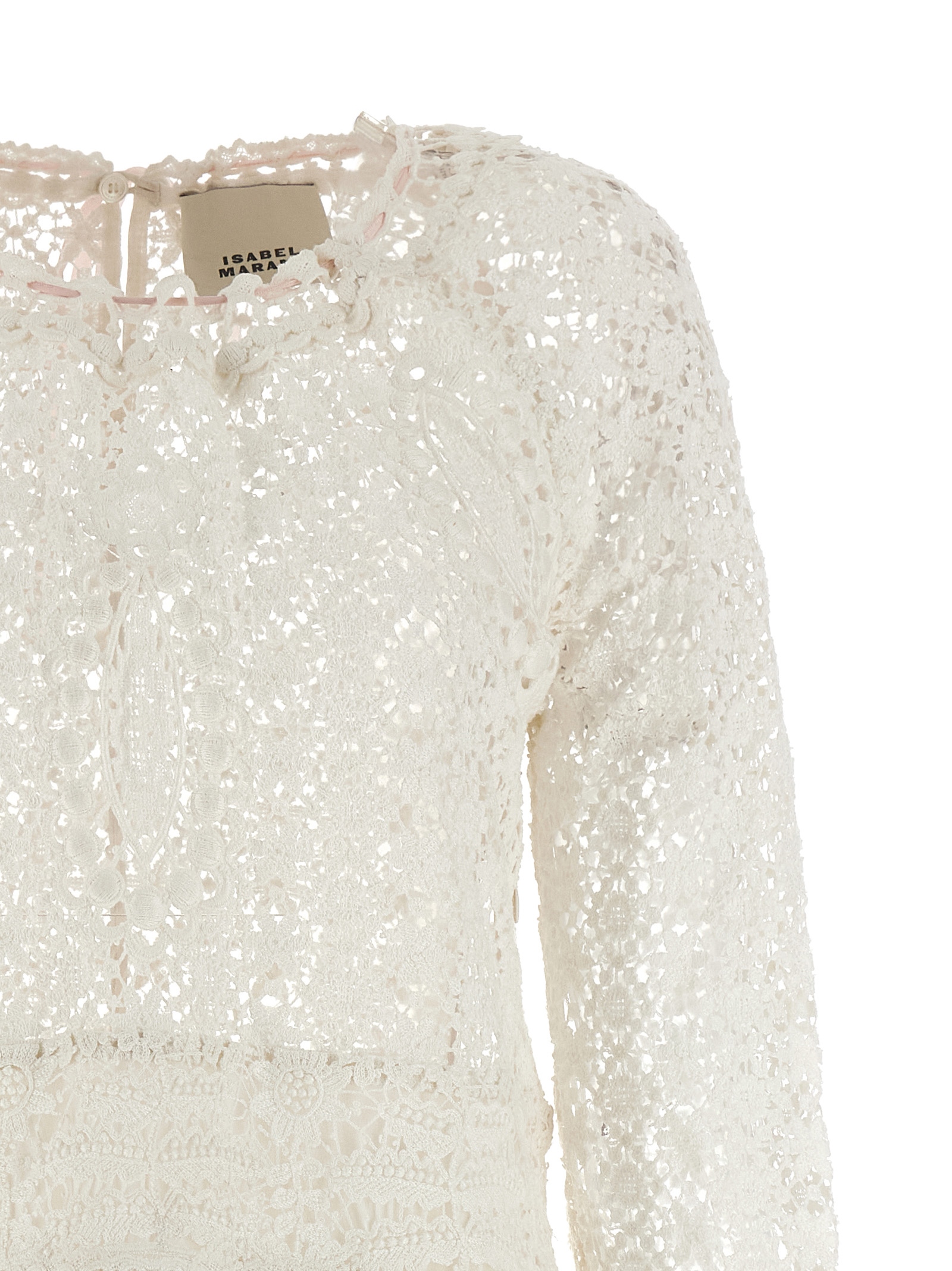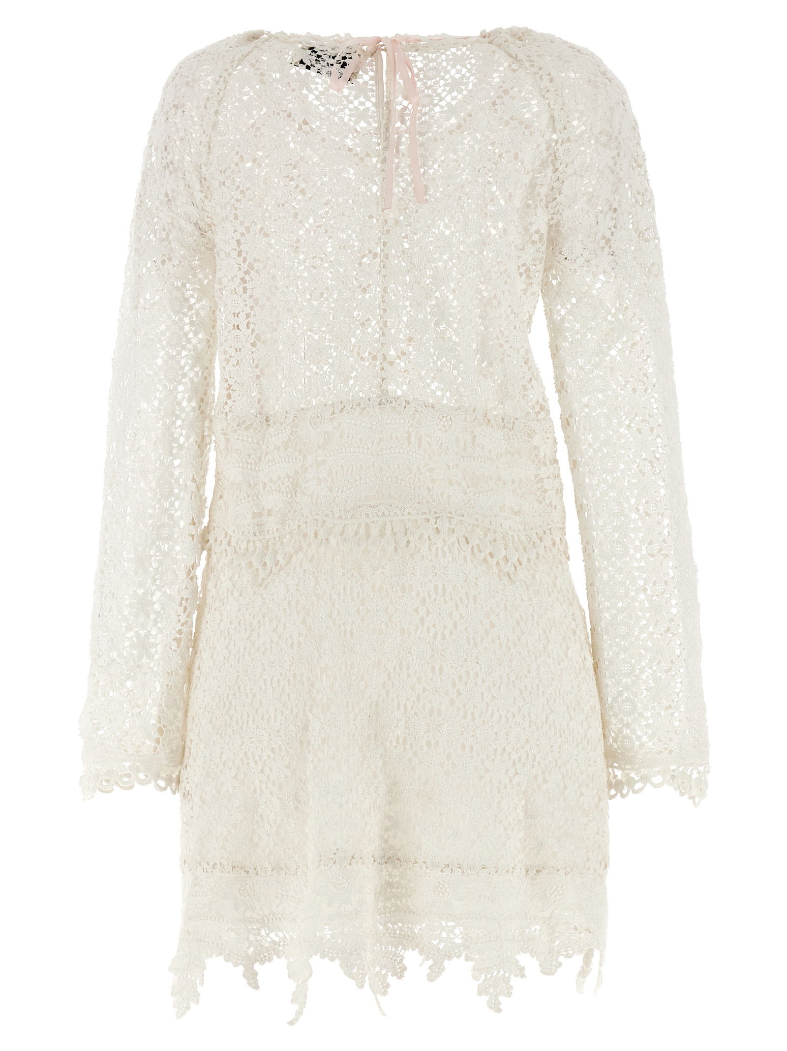 Mini ‘Hizene’ crochet openwork cotton dress, hourglass silhouette, crew neck with button closure and contrast back lace and teardrop cut-out detail, side zip closure, long sleeves with flared and asymmetrical cuffs, asymmetrical hem.