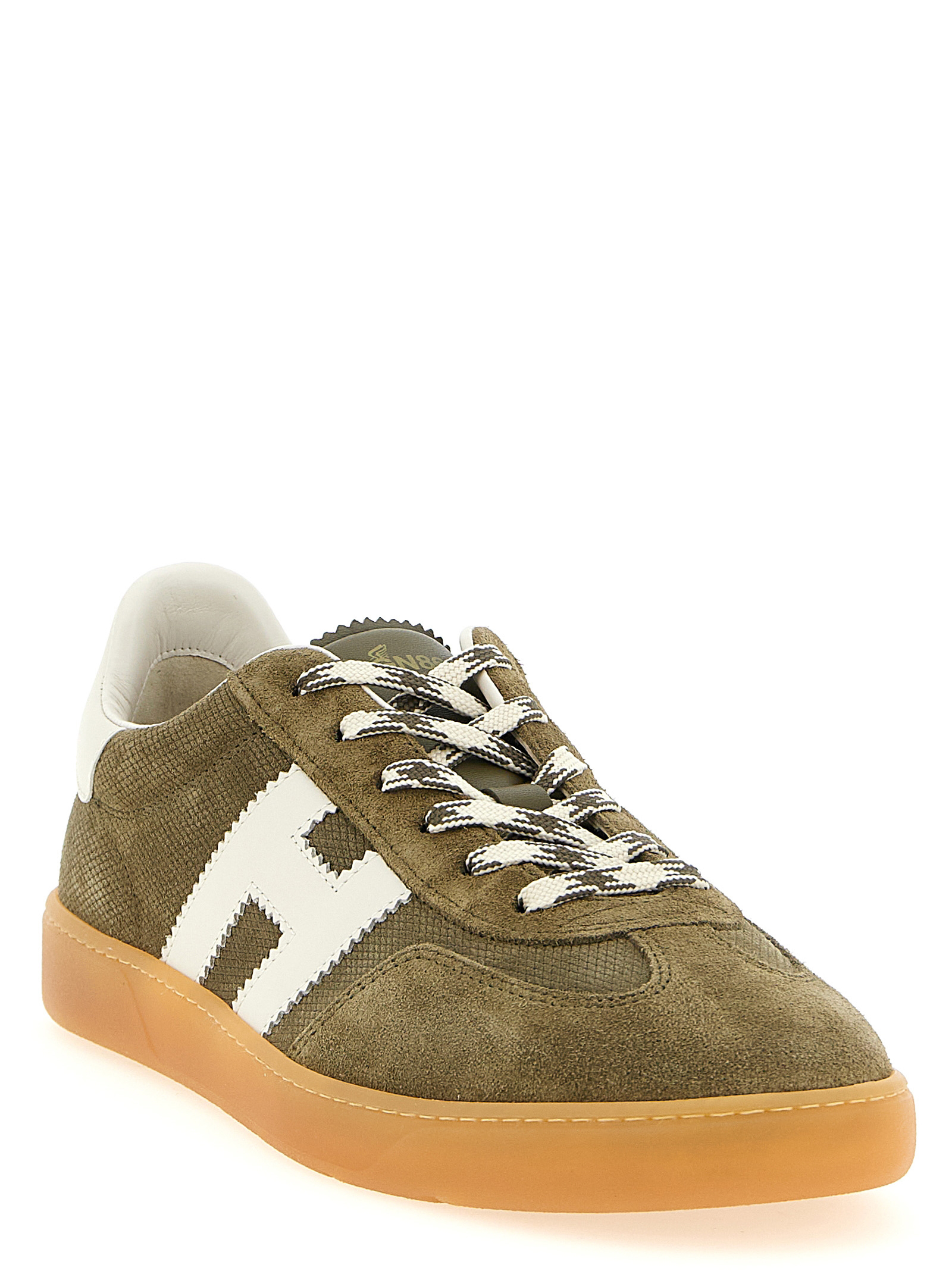 ‘Hogan Cool’ suede sneakers with contrast leather heel insert, padded tongue, serrated nappa side logo, lace-up closure, memory foam insole, rubber box sole.