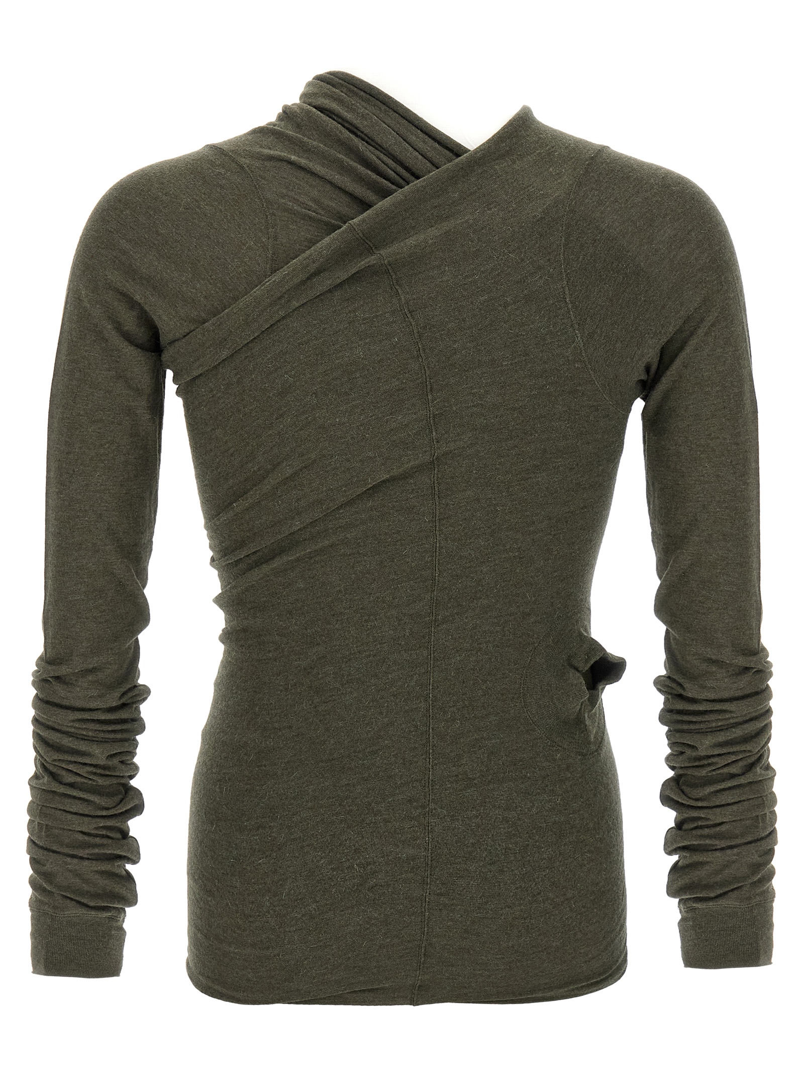 It has a bottom layer with two round holes with ribbed edges and an outer layer that folds to create a crossed draping on the front and back neck.