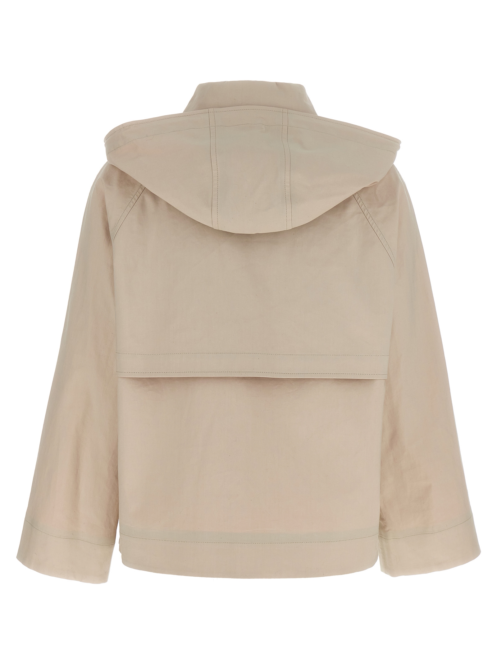 ‘Honolulu’ cotton jacket with removable hood, snap button closure, unlined, long sleeves, pockets.