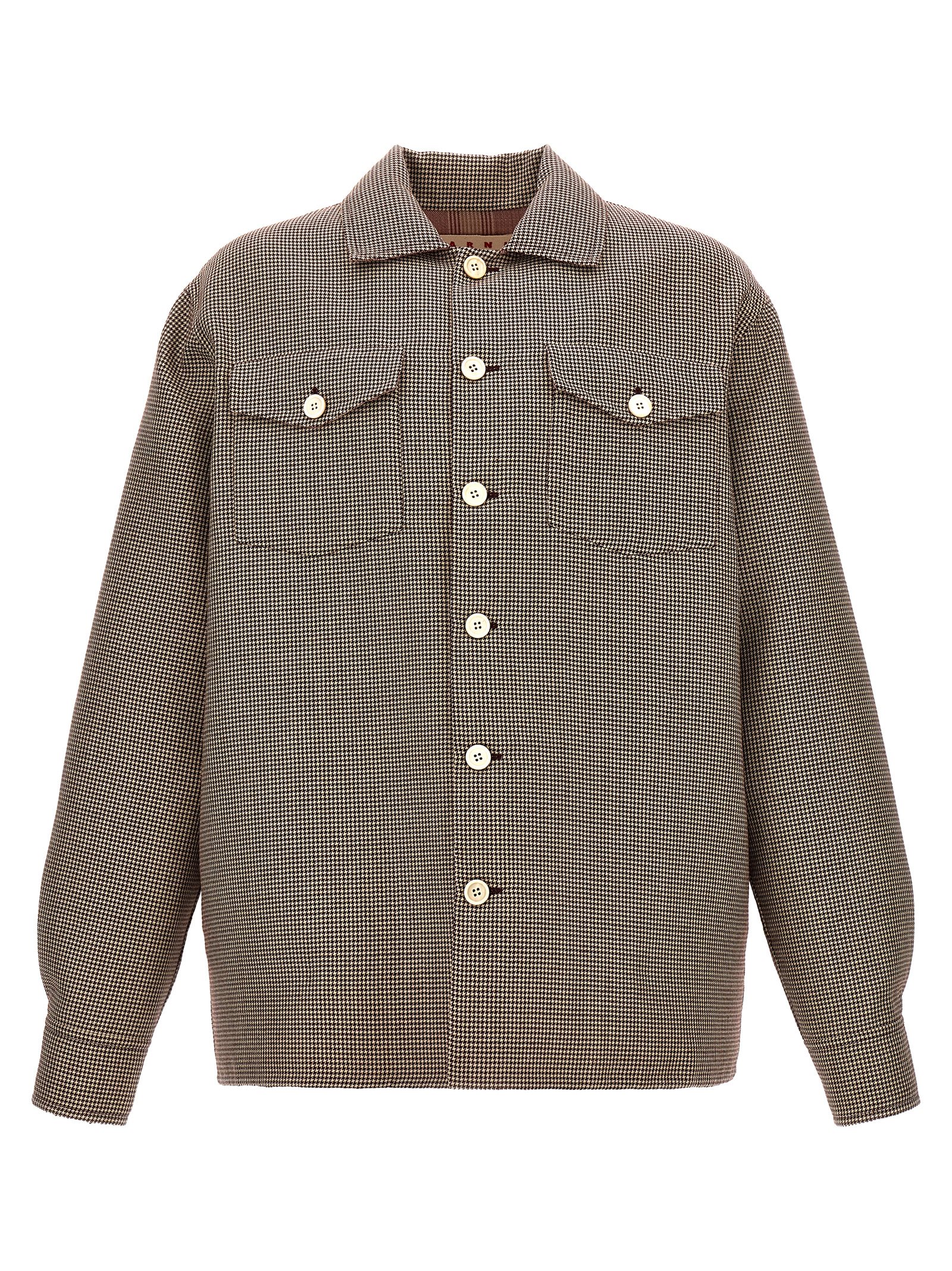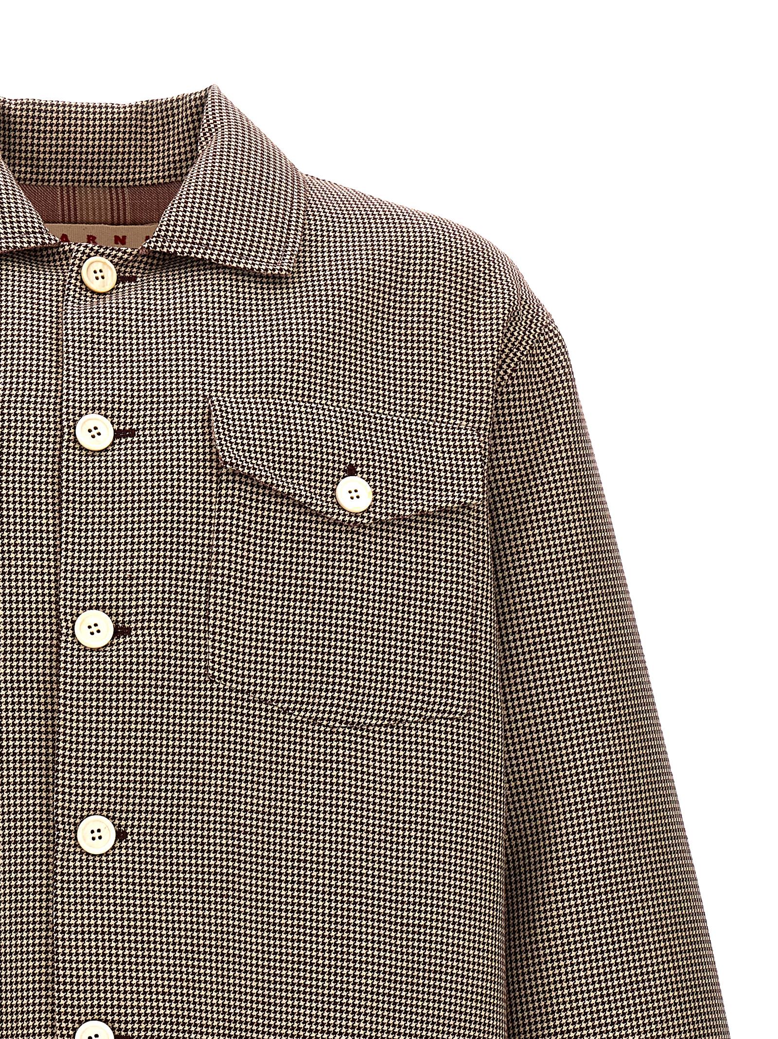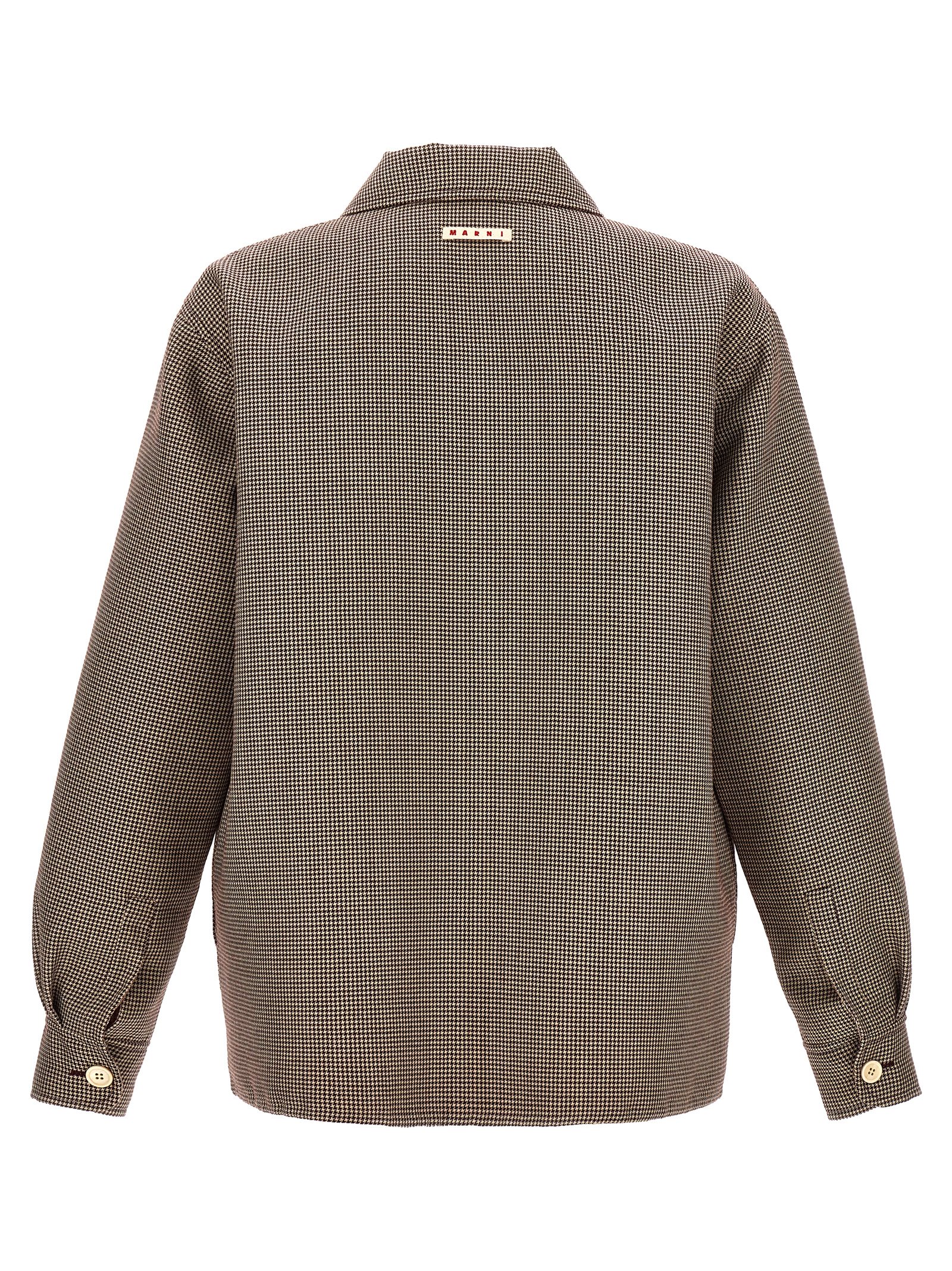 Micro houndstooth wool jacket, check inside print, button closure, pockets, long cuffed sleeves.